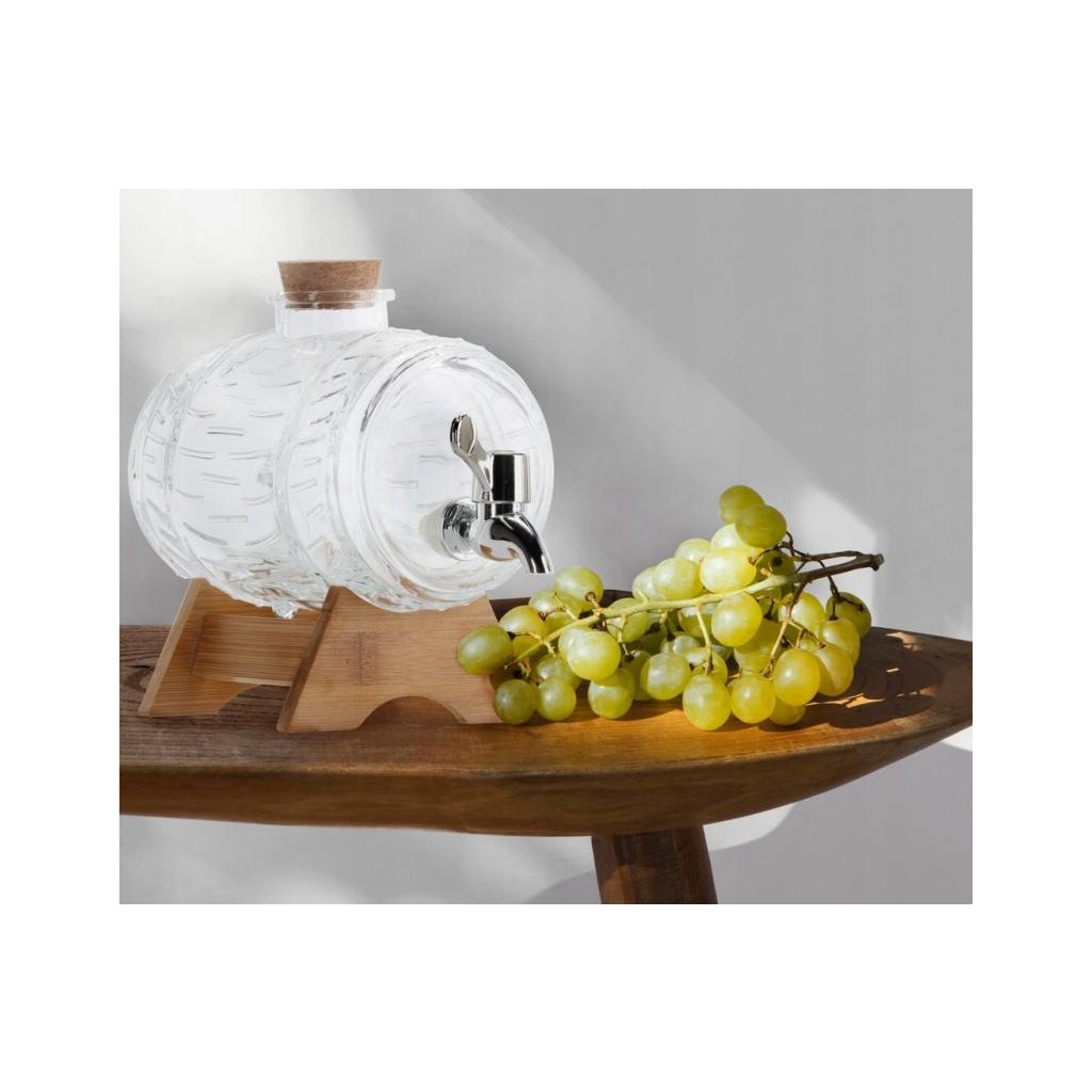 Sklenený sud s kohútikom, na drevenom stojane. Vďaka nej sa na párty či večer s priateľmi bude ešte dlho spomínať! Pohodlné použitie, elegantné a praktické. Na víno, pivo, džúsy a limonády. Vďaka stojanu je veľmi stabilný a vyrobený z hrubého skla. Karafa má praktický kohútik, ktorý uľahčuje dávkovanie tekutiny. Ideálne aj ako darček.