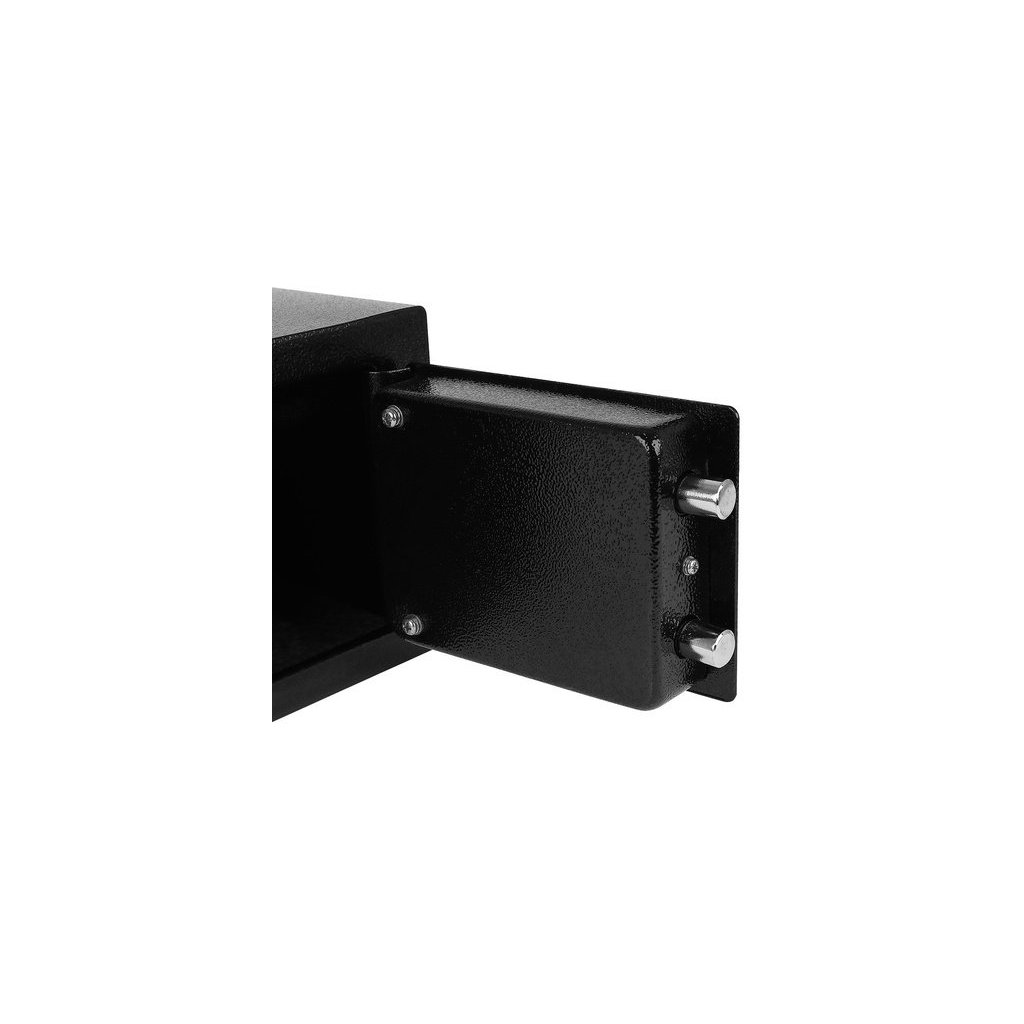 Sejf je vybavený pevnými skrutkami na dverách a jeho stabilná hmotnosť 2,7 kg znižuje riziko odcudzenia. Vnútri sejfu nájdete priestor vhodný na dokumenty formátu A5, peniaze, šperky, malé elektronické zariadenia a pamäťové médiá. Spodok sejfu je chránený materiálovou podložkou, ktorá zabraňuje poškodeniu cenností.