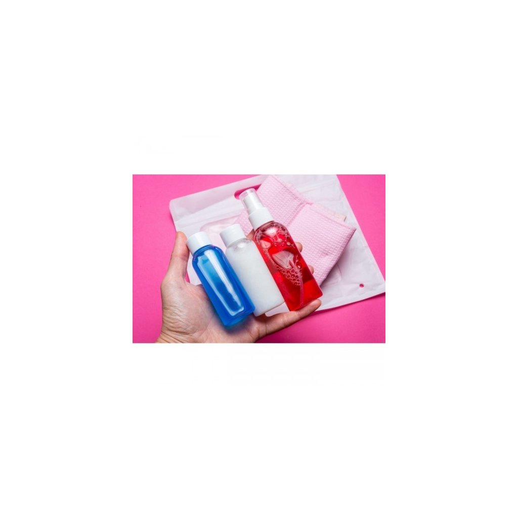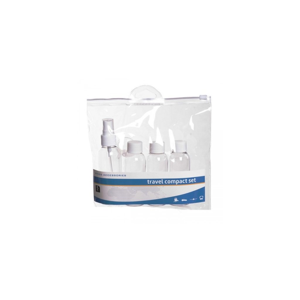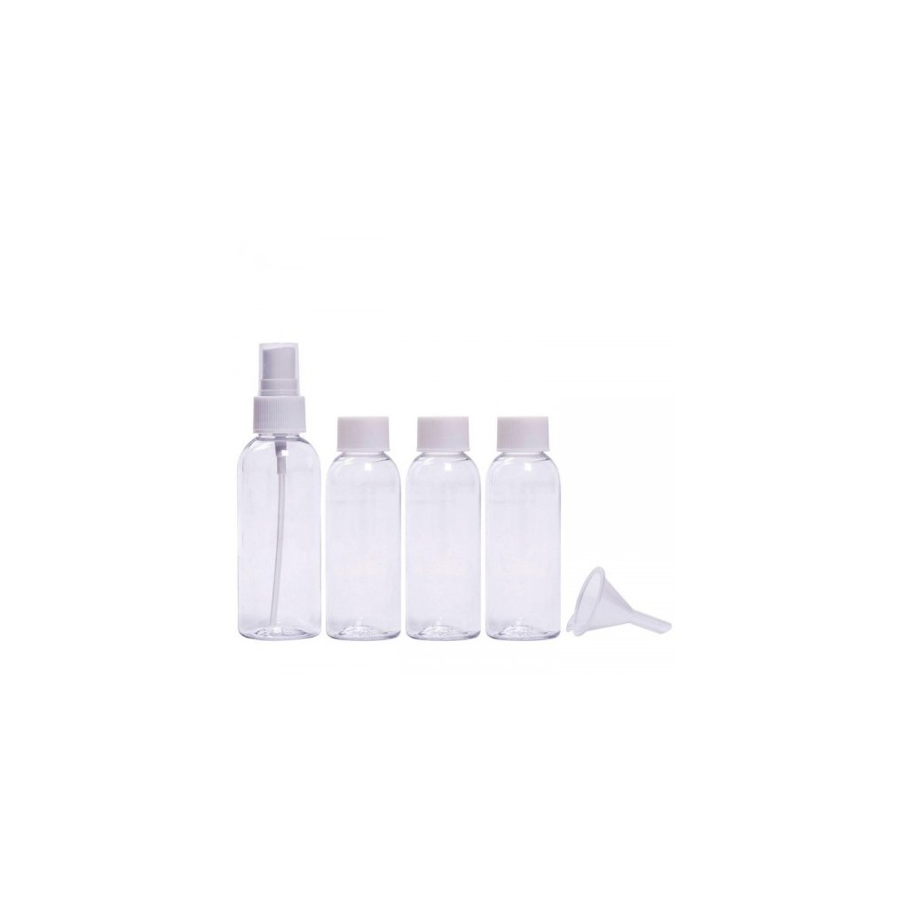 Súprava cestovných kozmetických nádob ideálna na cestovanie, najmä v príručnej batožine v lietadle. Súprava obsahuje 3 nádoby s objemom 50 ml s uzáverom, 1 nádobku s objemom 80 ml so sprey maticou, lievikom, cez ktorý môžete ľahko preliať Vašu drogériu a priehľadný plastový vak, ktorý uľahčuje skladovanie nádob.