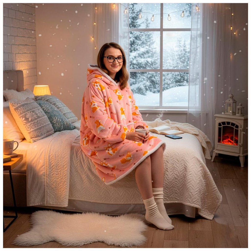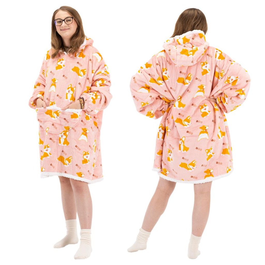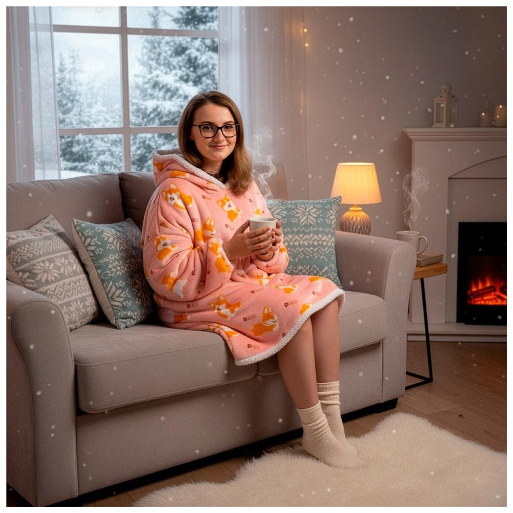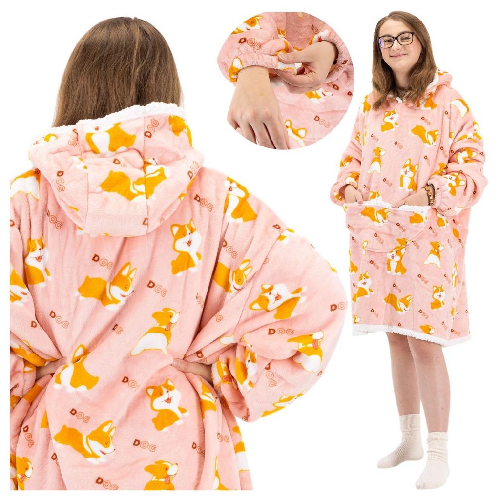 Dámska oversize deka mikina 2 v 1 s kapucňou – teplý plyšový župan s motívom corgi Springos HA7572