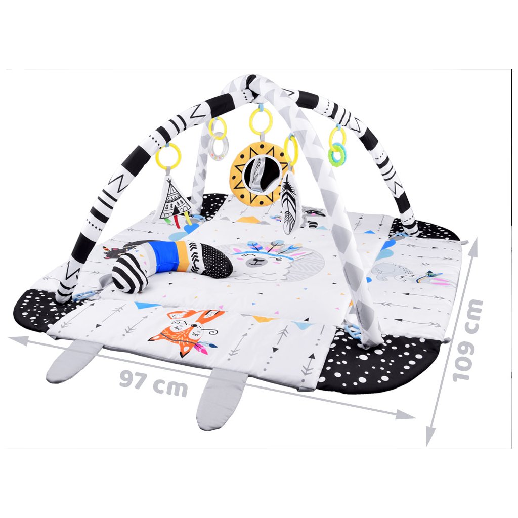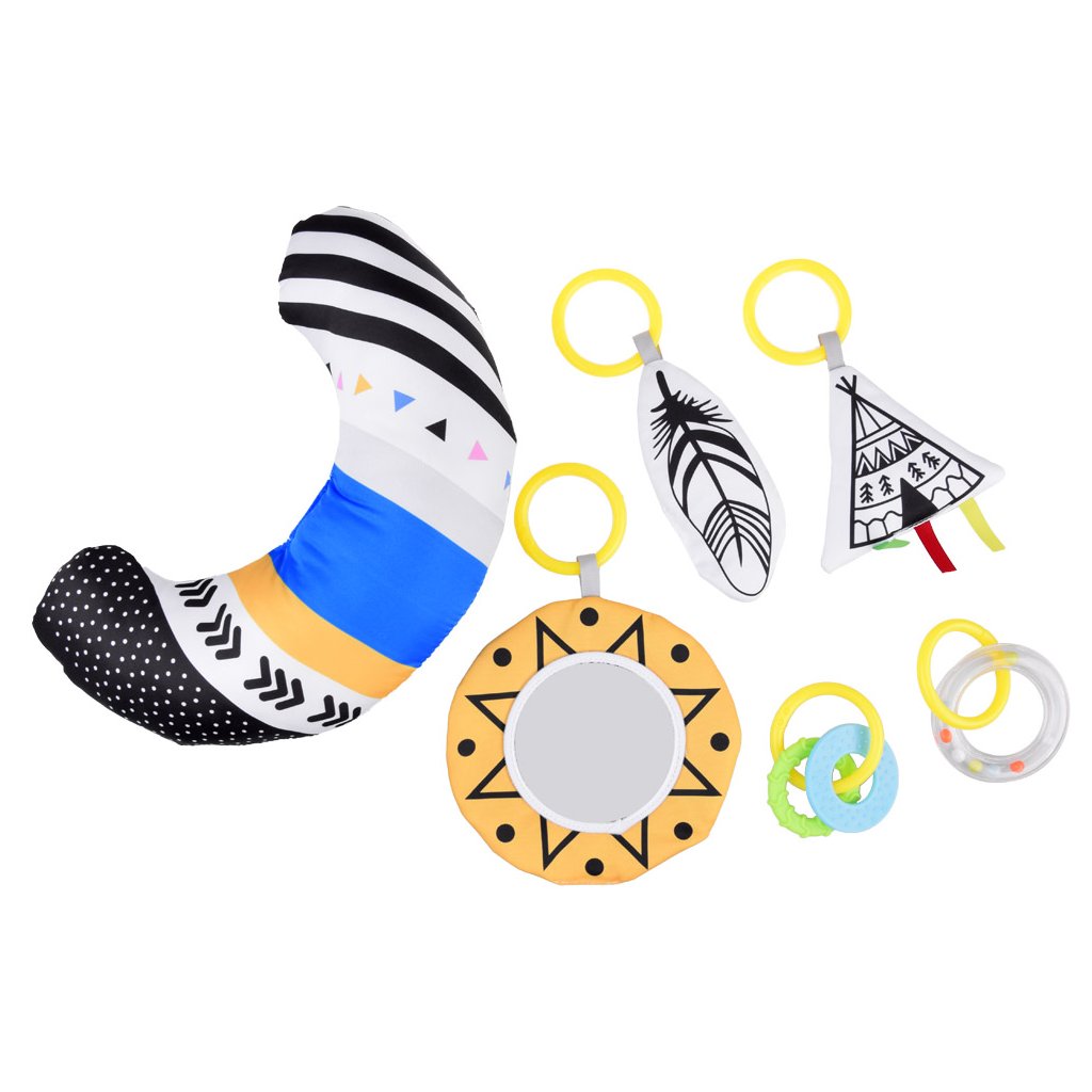 - Kvalitné doplnky: Odnímateľné hračky, bezpečné zrkadlo, hryzátka a mäkký vankúšik na bruško.