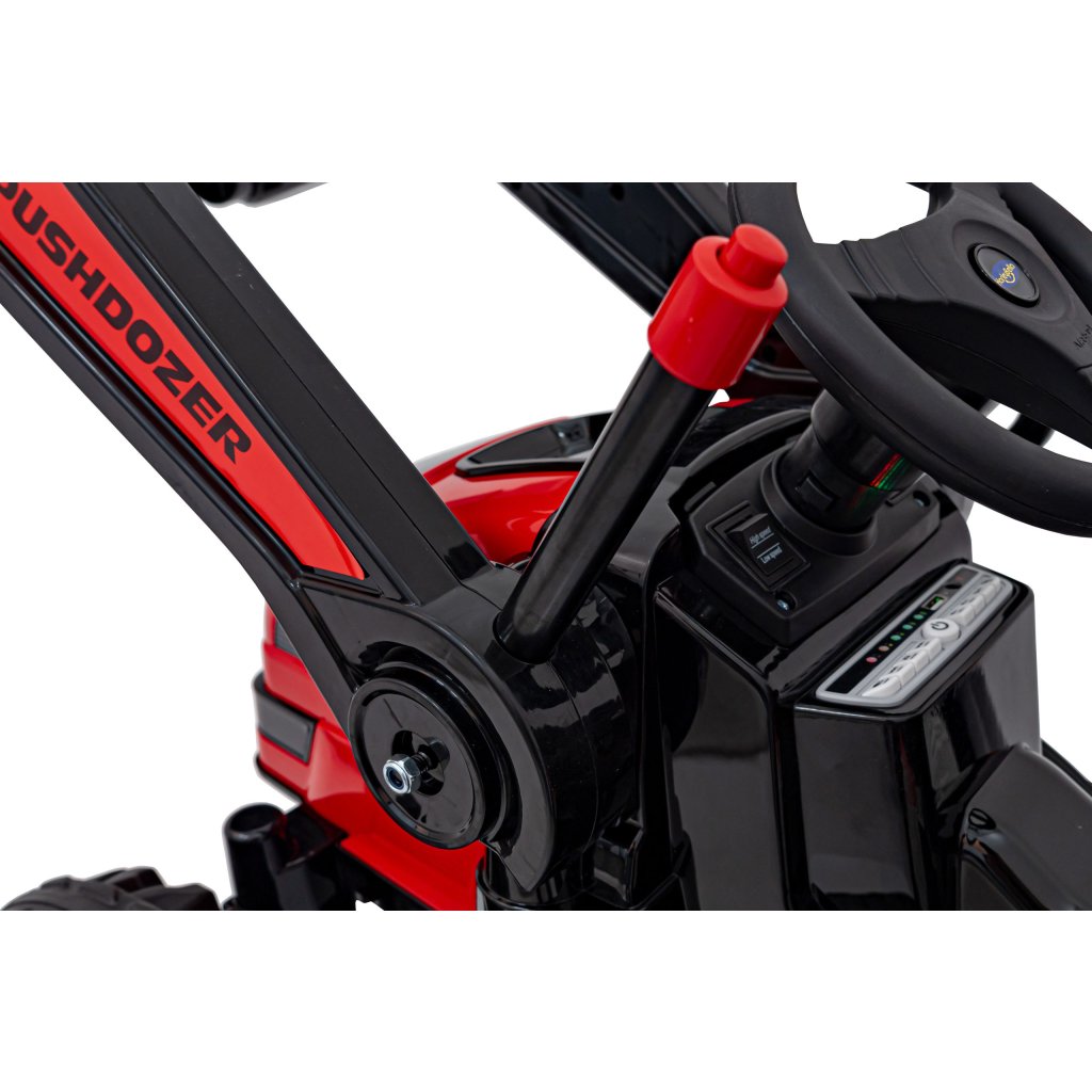 Červený detský elektrický traktorový bager 12V s diaľkovým ovládaním, pohyblivým ramenom a FM rádiom