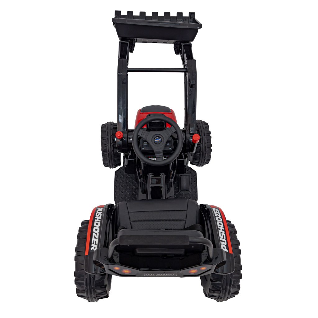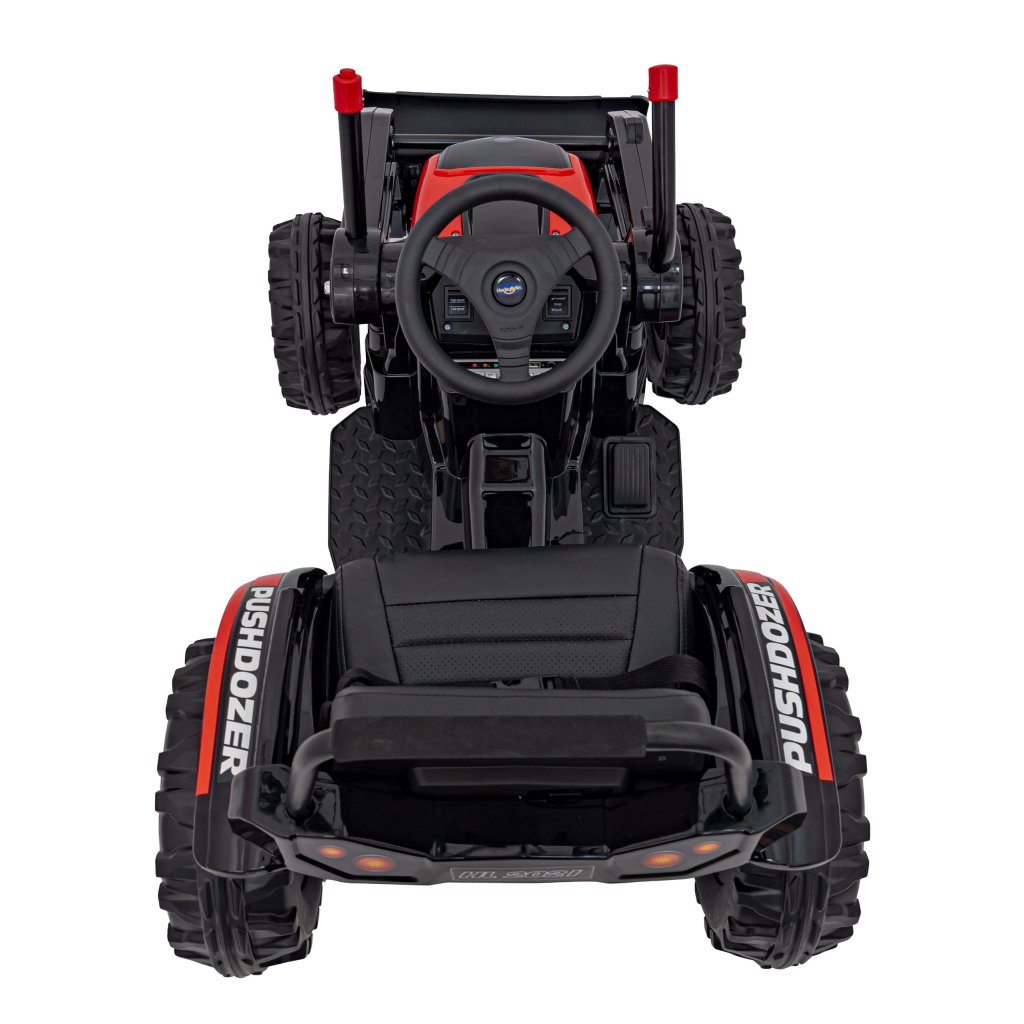 Červený detský traktorový bager na batérie – 2×35W motor, 12V/7Ah batéria, pohyblivé rameno, diaľkové ovládanie, pomalý štart, FM rádio a LED svetlá