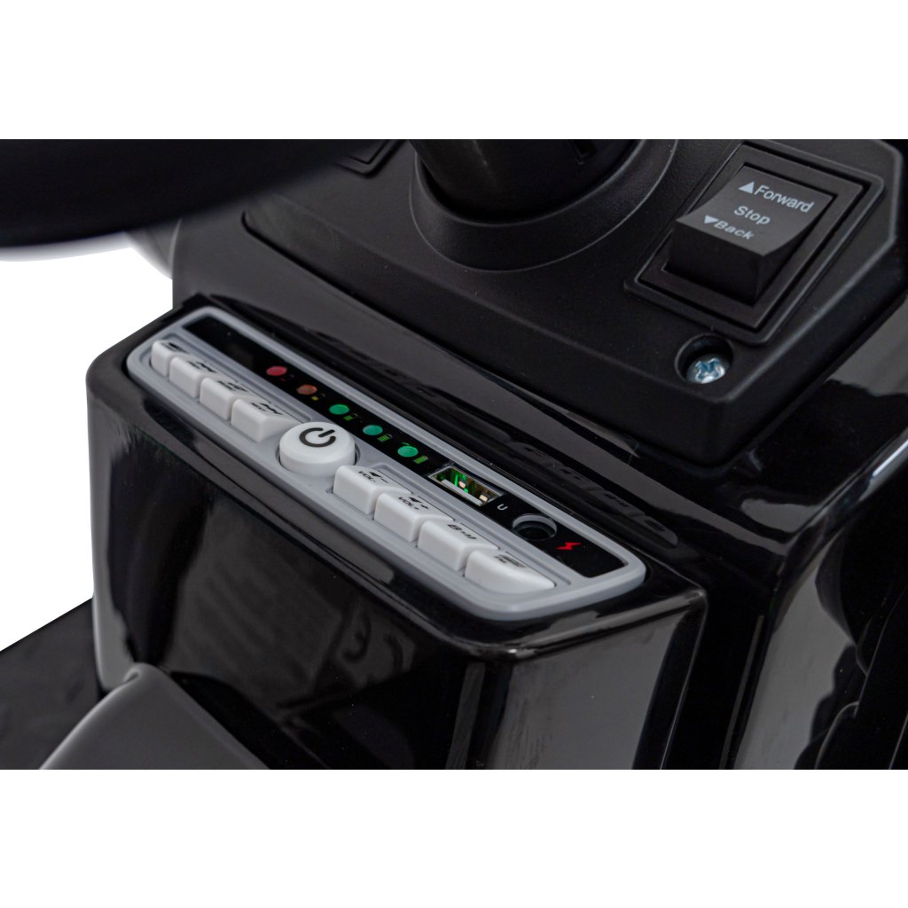 Malý vodič si môže užiť svoju obľúbenú hudbu vďaka MP3, USB a Bluetooth pripojeniu, alebo si vybrať z prednastavených melódií. Vstavané FM rádio, realistický zvuk štartovania motora a klaksón dodajú jazde autentickú atmosféru.