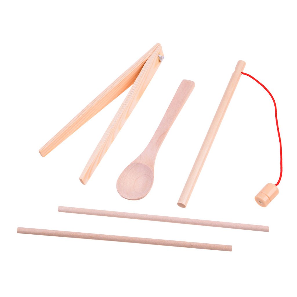 Pomôcky: drevené palice, kliešte, lyžica a rybársky prút