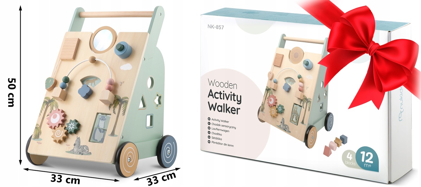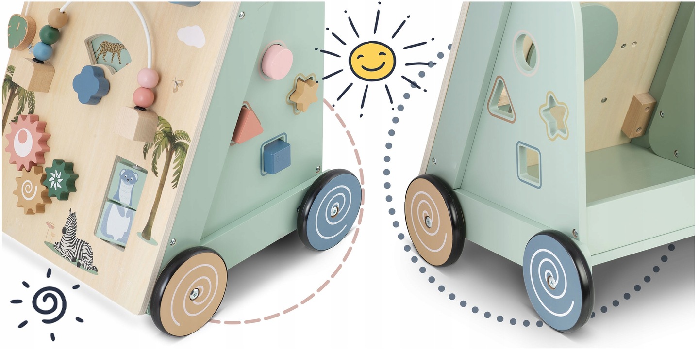 Drevené chodítko – pchadlo Nukido NK-857 je ideálnym pomocníkom pre deti pri nácviku prvých krokov. Spája stabilnú oporu s množstvom interaktívnych prvkov, ktoré podporujú pohybový, zmyslový aj kognitívny rozvoj dieťaťa. Hračka je inšpirovaná princípmi Montessori pedagogiky a vyrobená z kvalitného prírodného dreva.