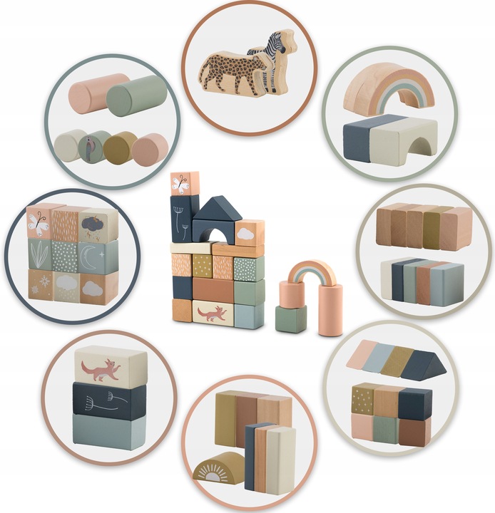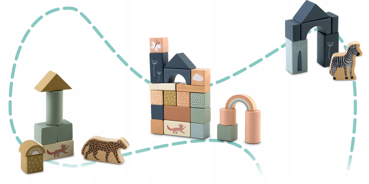 - 70 drevených blokov rôznych tvarov, veľkostí a farieb – sú určené na stavanie a tvorenie rôznych konštrukcií.