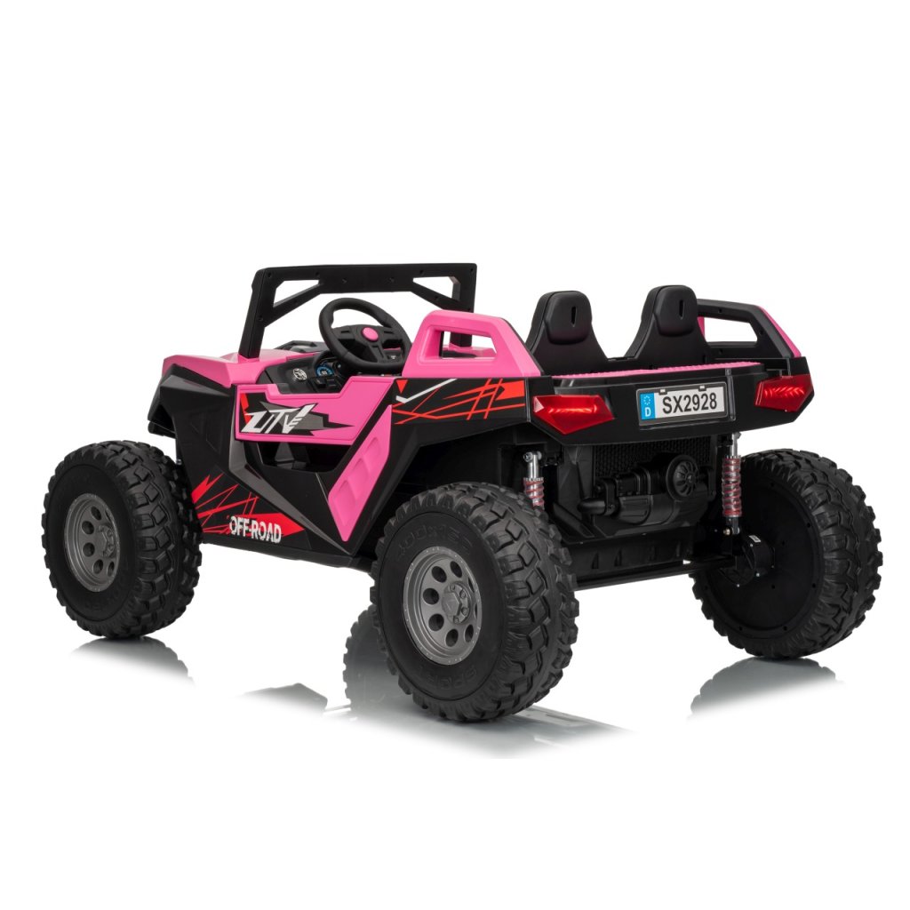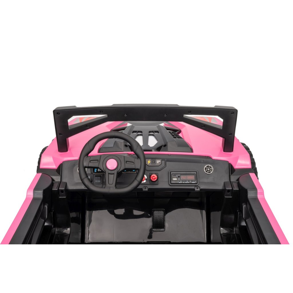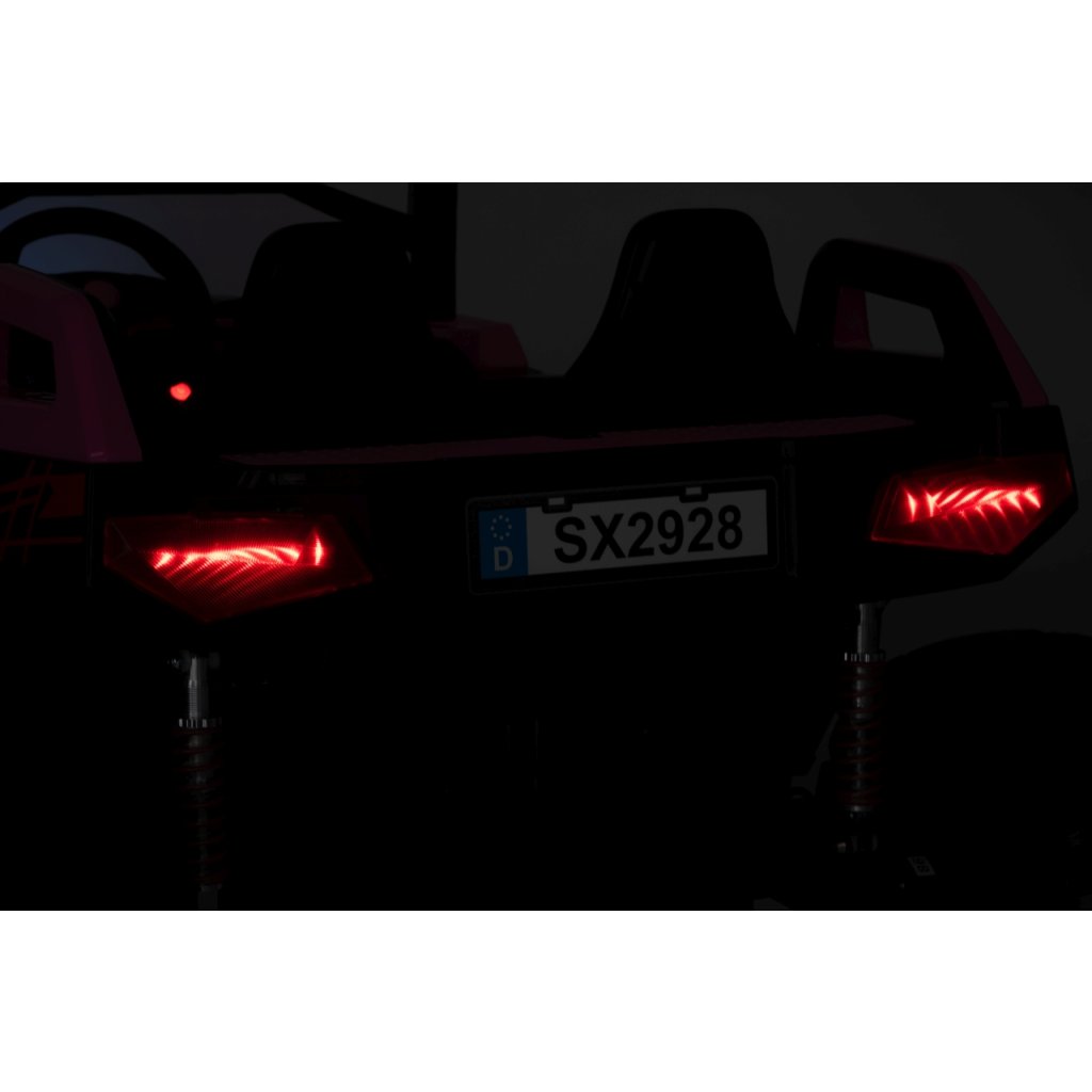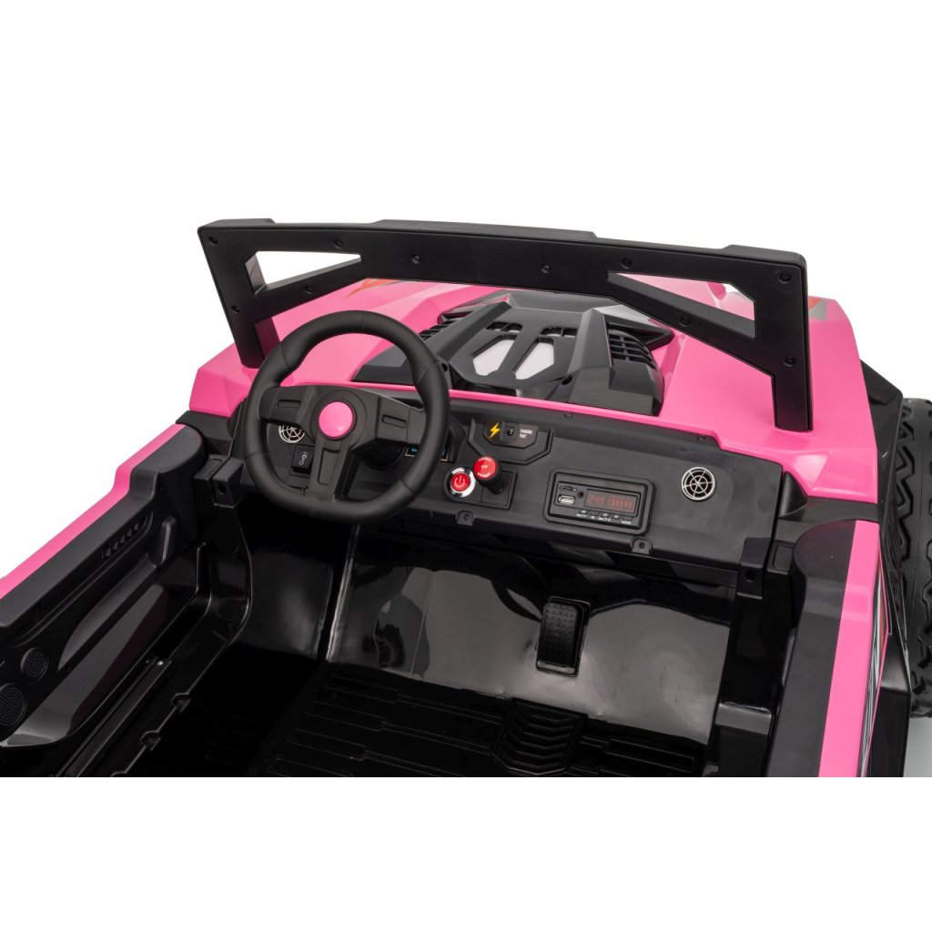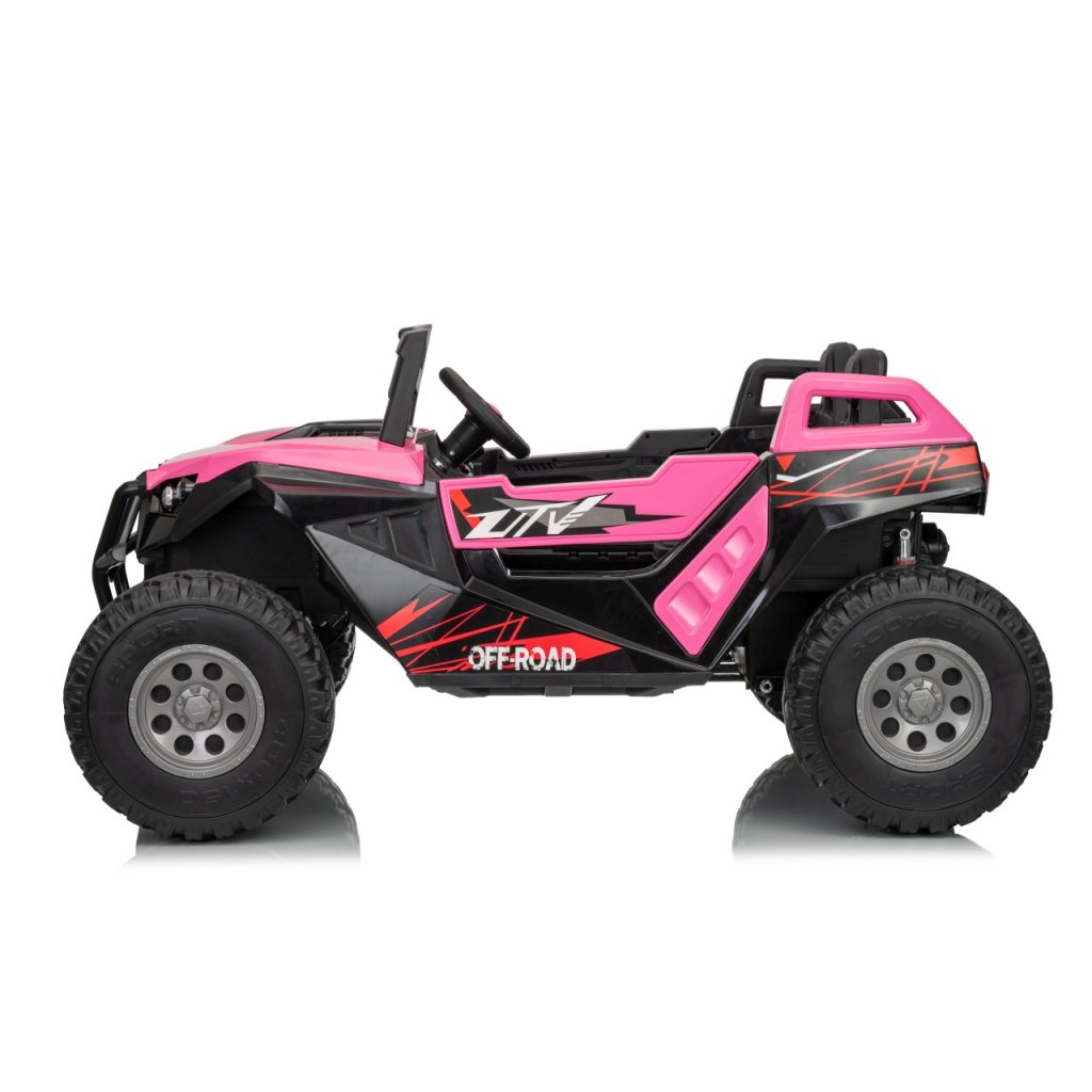 Elektrické Buggy RTR Monster Speed 4x4 v ružovej farbe je výkonný dvojmiestny pojazd pre deti, ktorý kombinuje vysoký výkon, odolnosť a moderný dizajn. Vďaka štyrom motorom (2×45 W vpredu a 2×300 W vzadu) a systému pohonu 4×4 si hravo poradí aj s náročným terénom.Tento model zo série 24 V ponúka plynulý rozjazd, LED osvetlenie, podsvietenú masku, realistické zvuky motora a bohaté multimediálne funkcie – od Bluetoothu až po FM rádio. Vetrané kožené sedadlo z ekokože a bezpečnostné pásy zaručujú komfort aj bezpečnosť pri jazde.