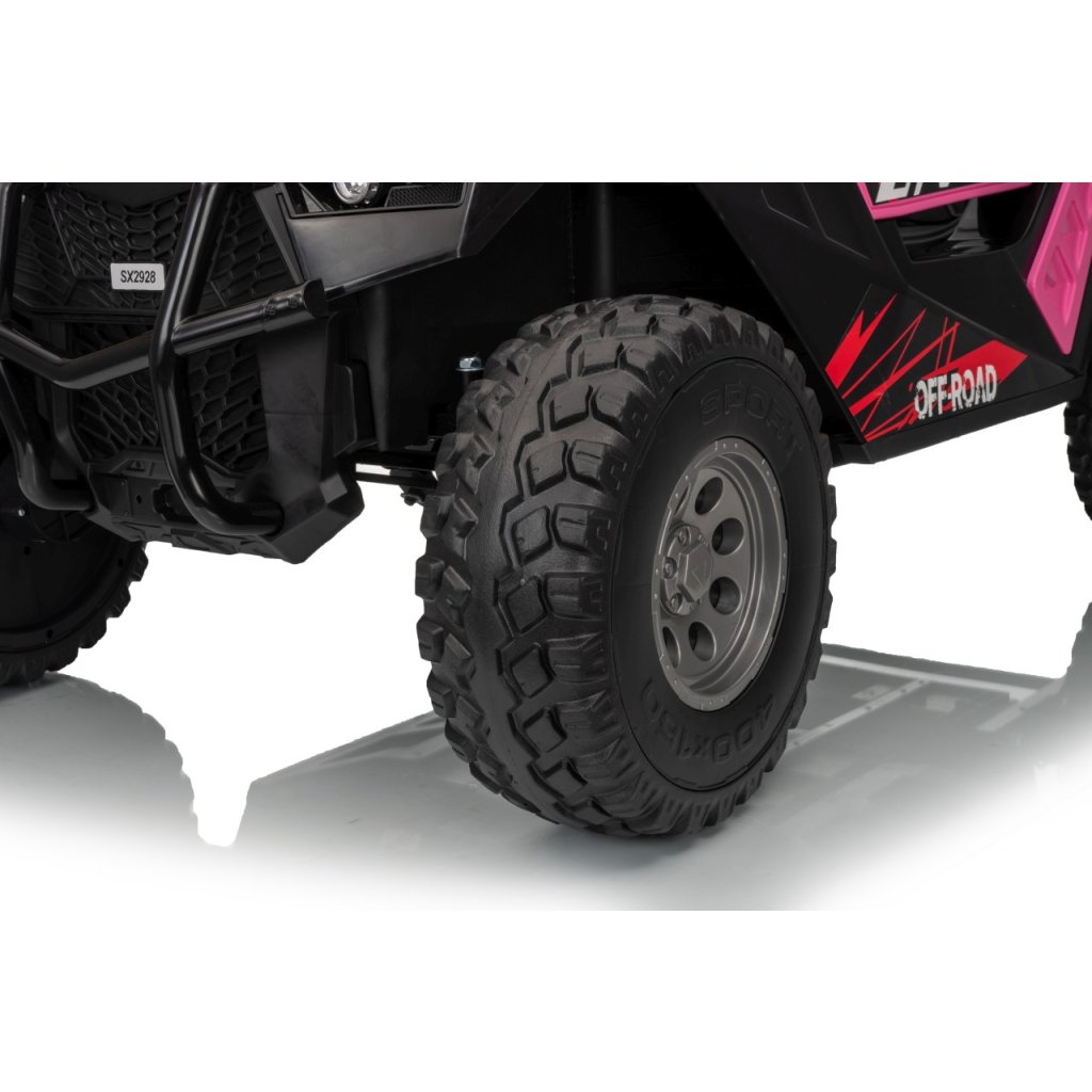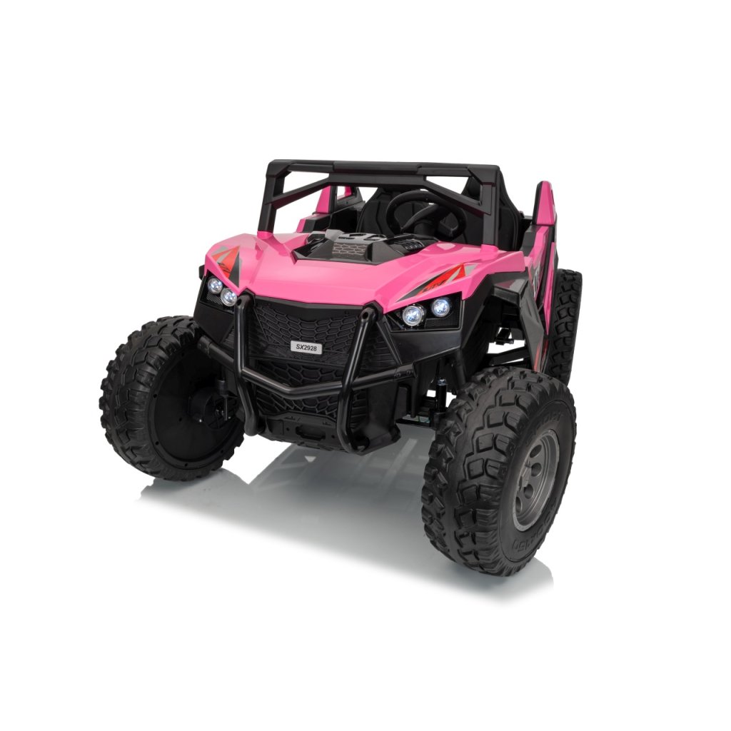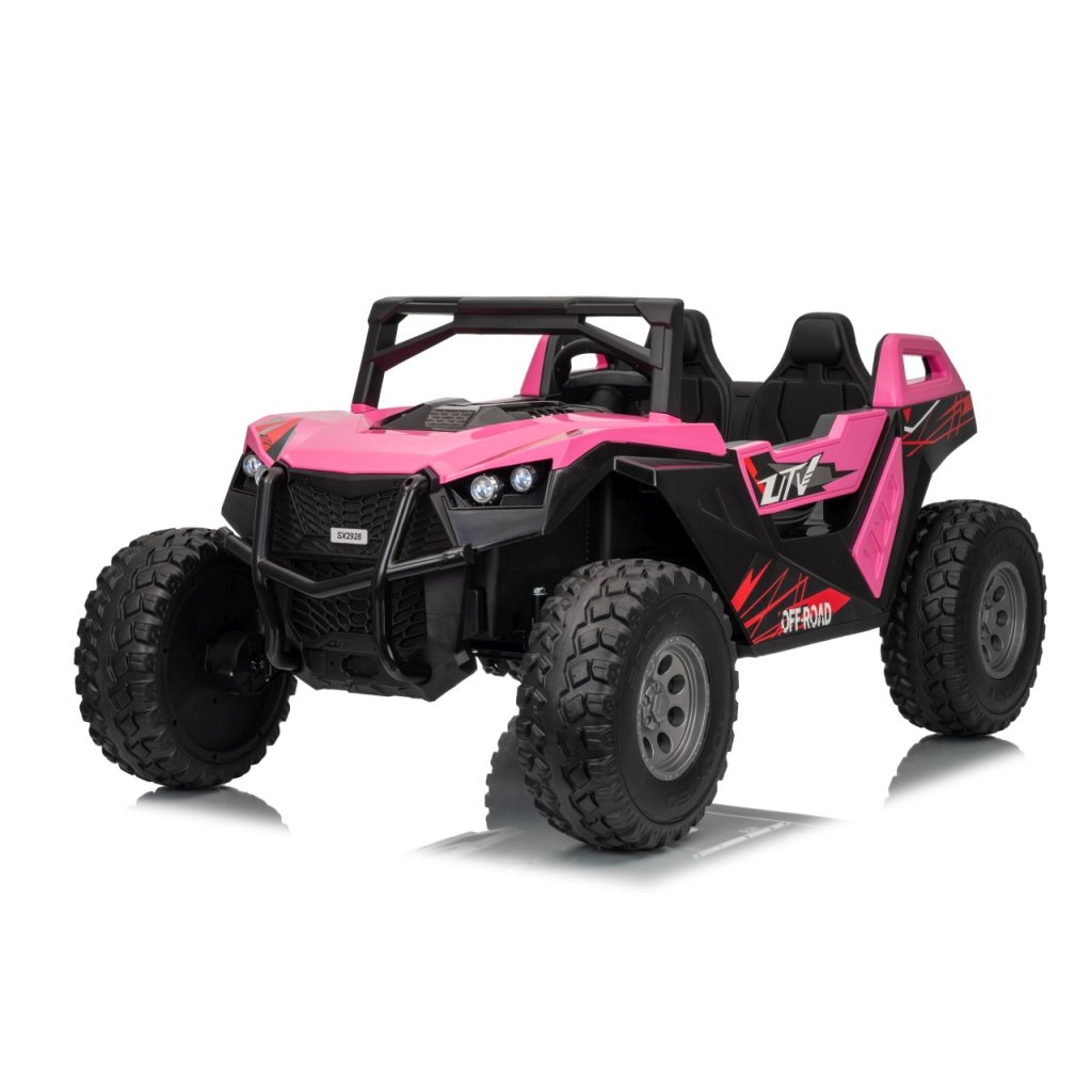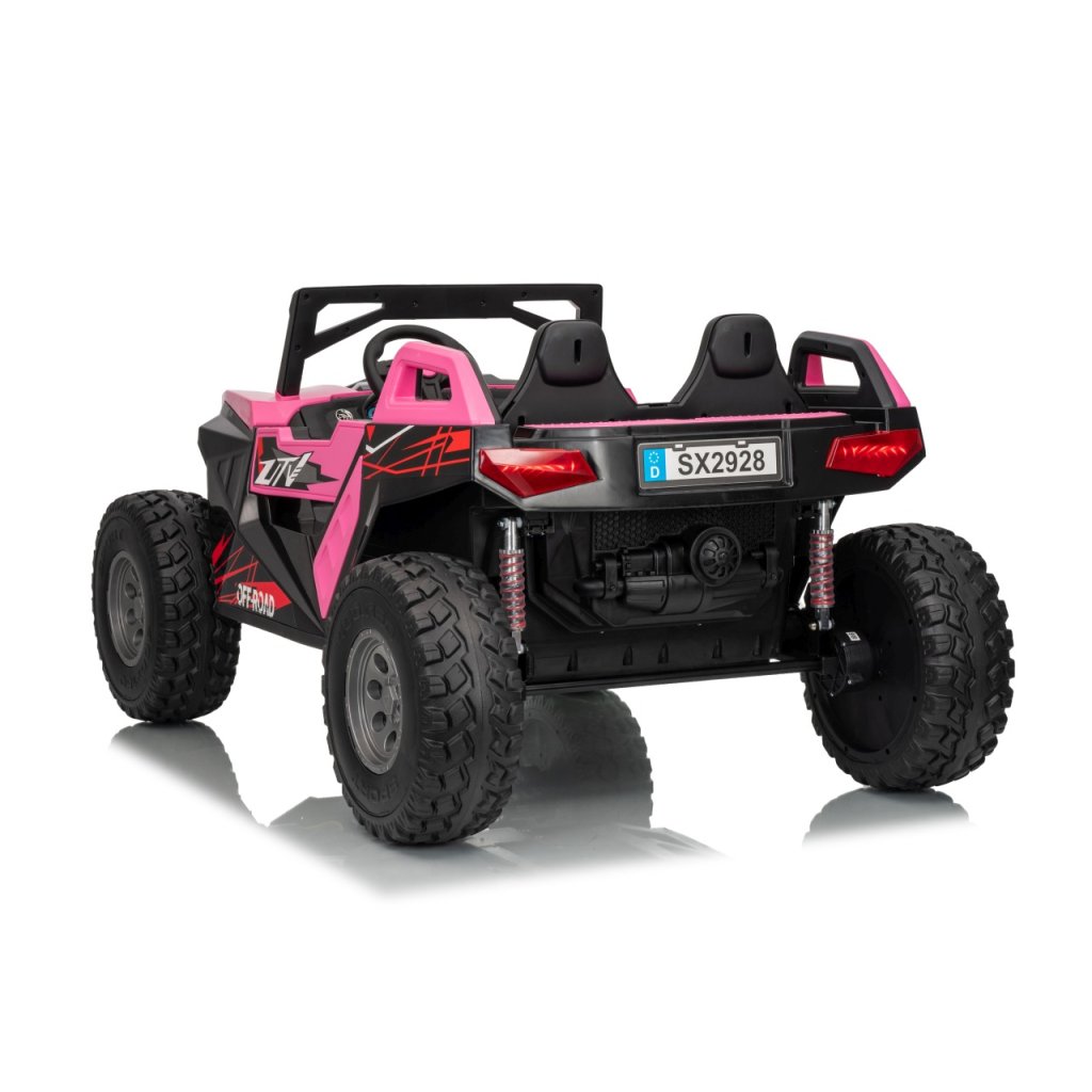 Elektrické Buggy RTR Monster Speed 4x4 v ružovej farbe je výkonný dvojmiestny pojazd pre deti, ktorý kombinuje vysoký výkon, odolnosť a moderný dizajn. Vďaka štyrom motorom (2×45 W vpredu a 2×300 W vzadu) a systému pohonu 4×4 si hravo poradí aj s náročným terénom.Tento model zo série 24 V ponúka plynulý rozjazd, LED osvetlenie, podsvietenú masku, realistické zvuky motora a bohaté multimediálne funkcie – od Bluetoothu až po FM rádio. Vetrané kožené sedadlo z ekokože a bezpečnostné pásy zaručujú komfort aj bezpečnosť pri jazde.