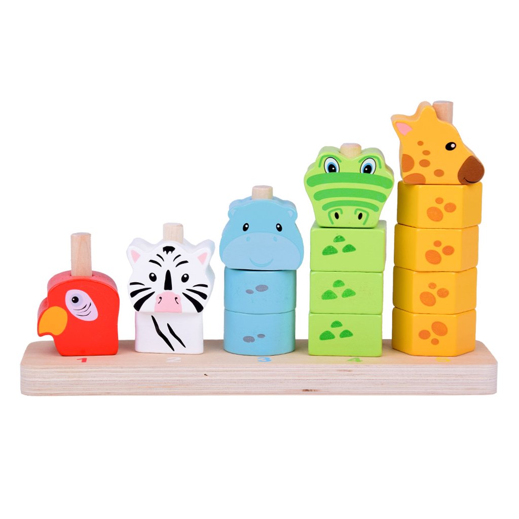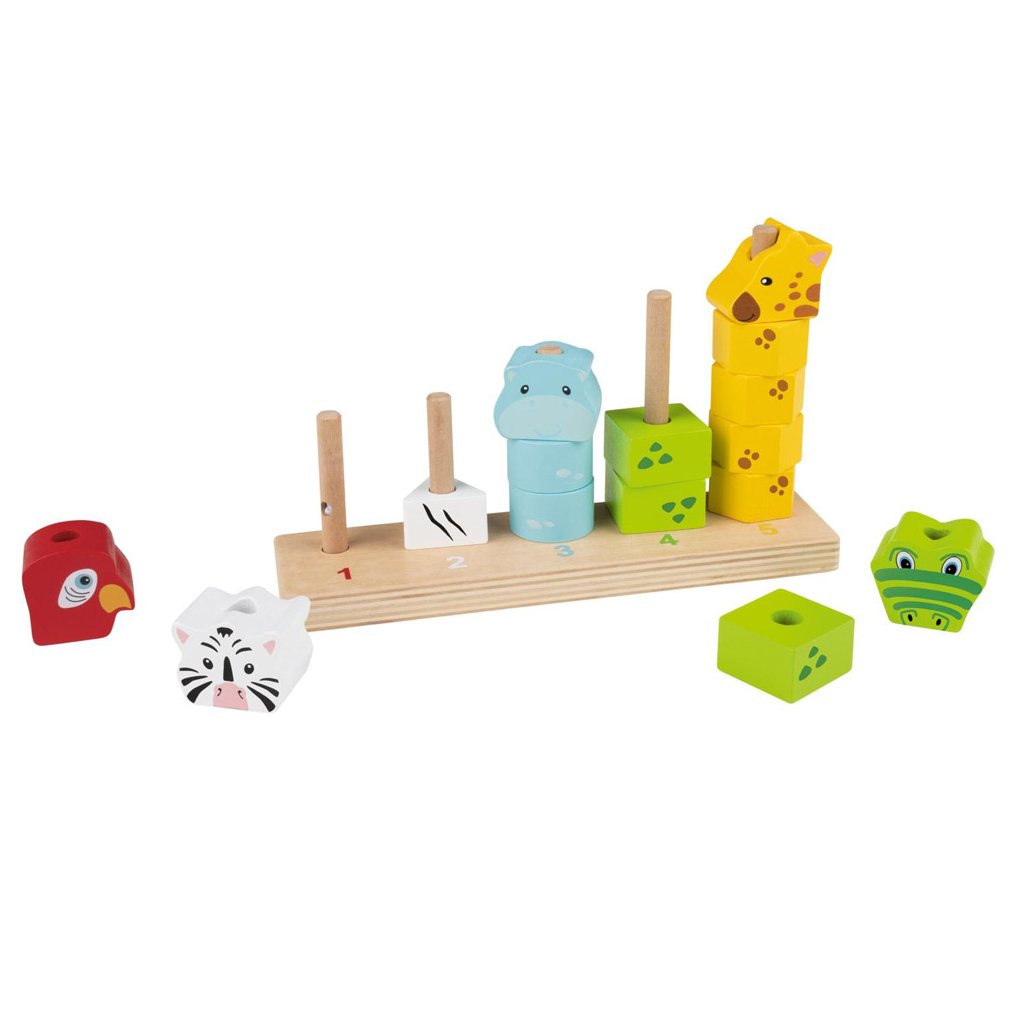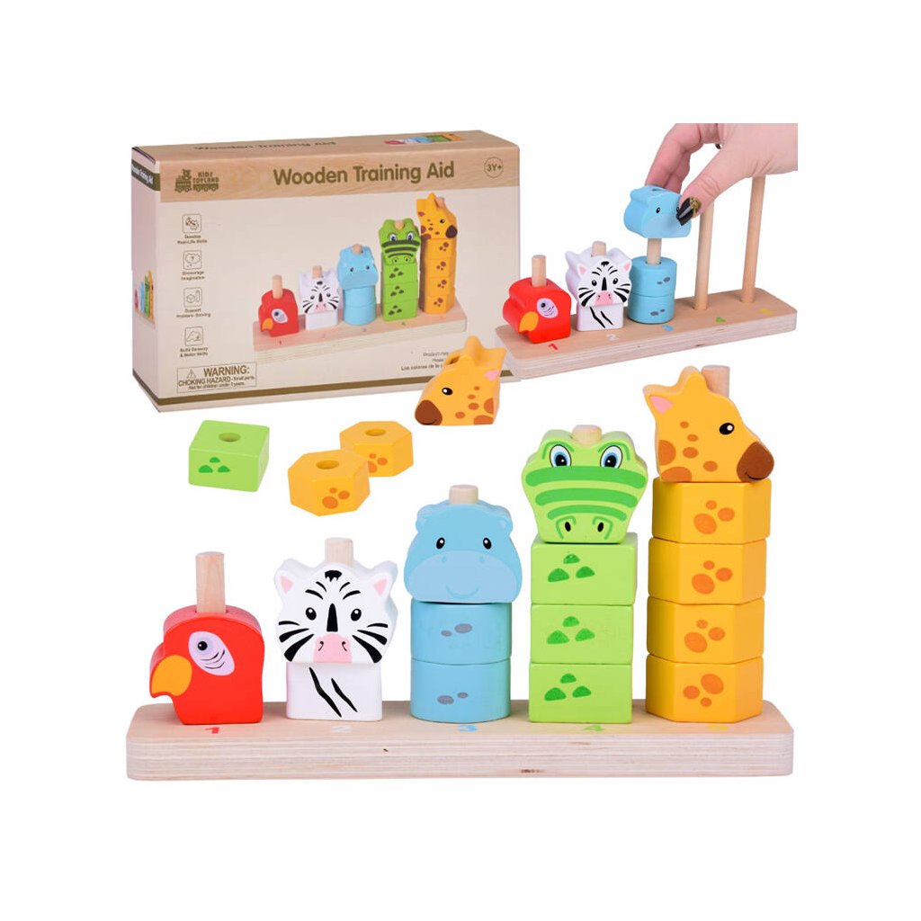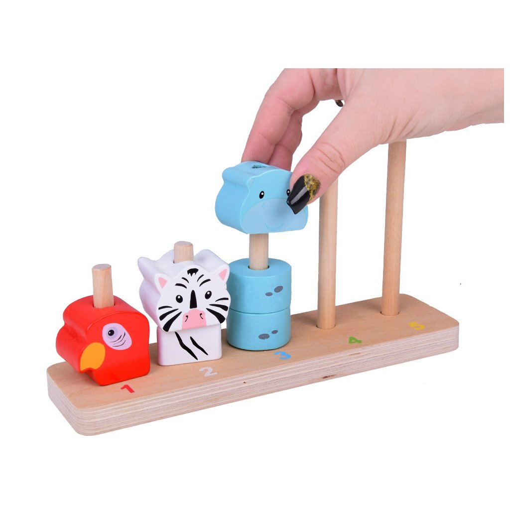 Každé zvieratko má inú farbu – červenú, bielu, modrú, zelenú alebo žltú – a je zložené z rôzneho počtu drevených blokov. Dieťa sa prirodzene učí rozpoznávať farby a tvary pri skladaní pyramídy.