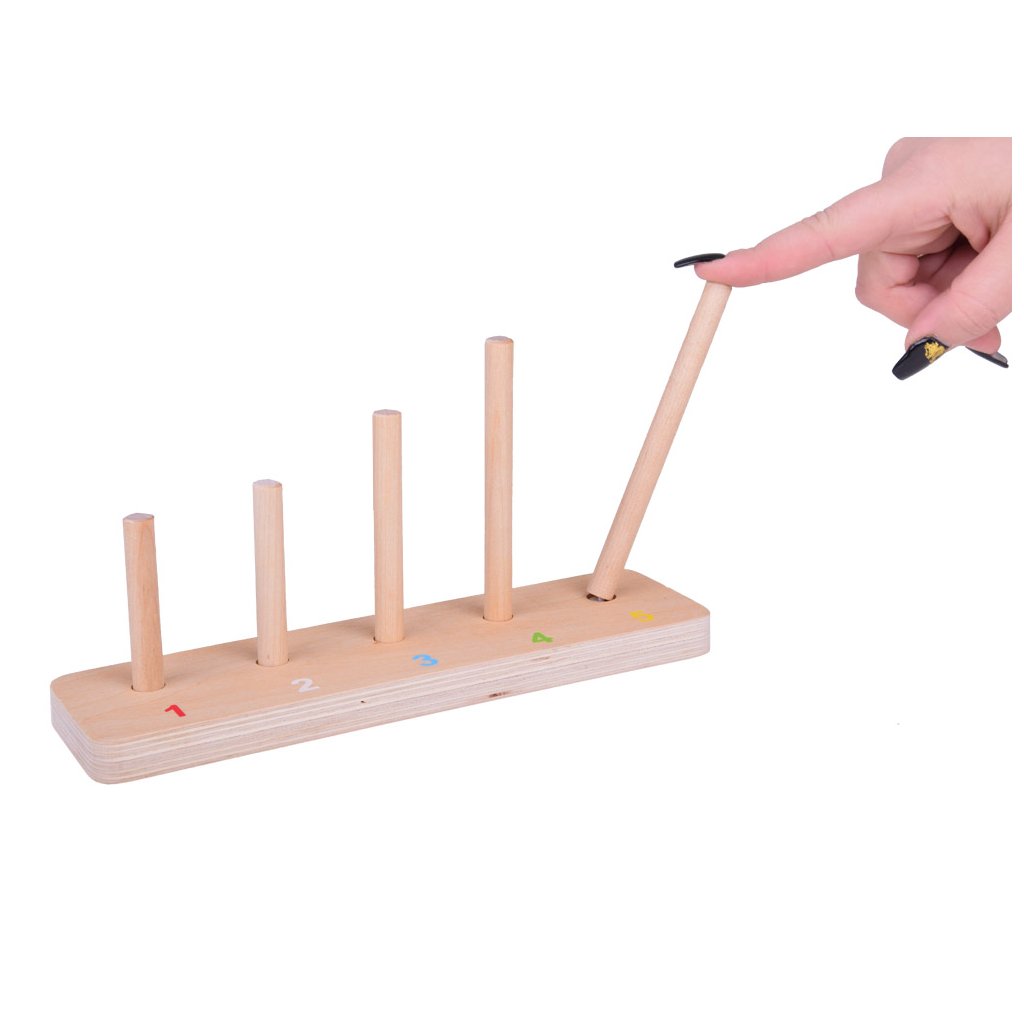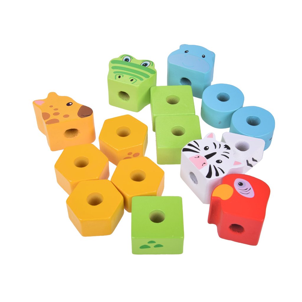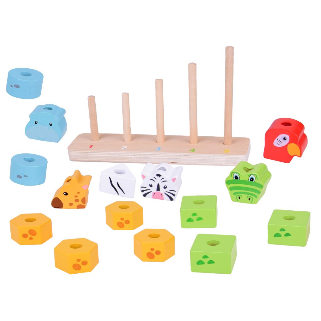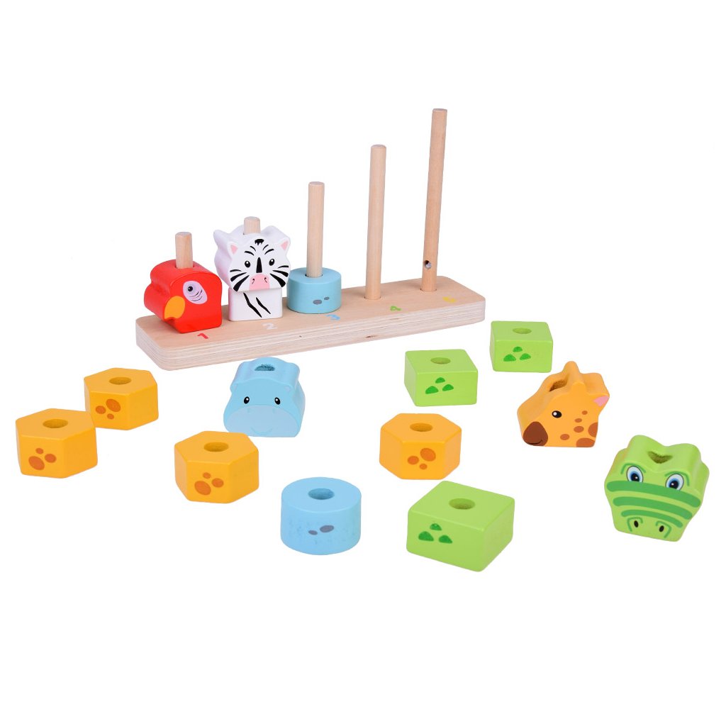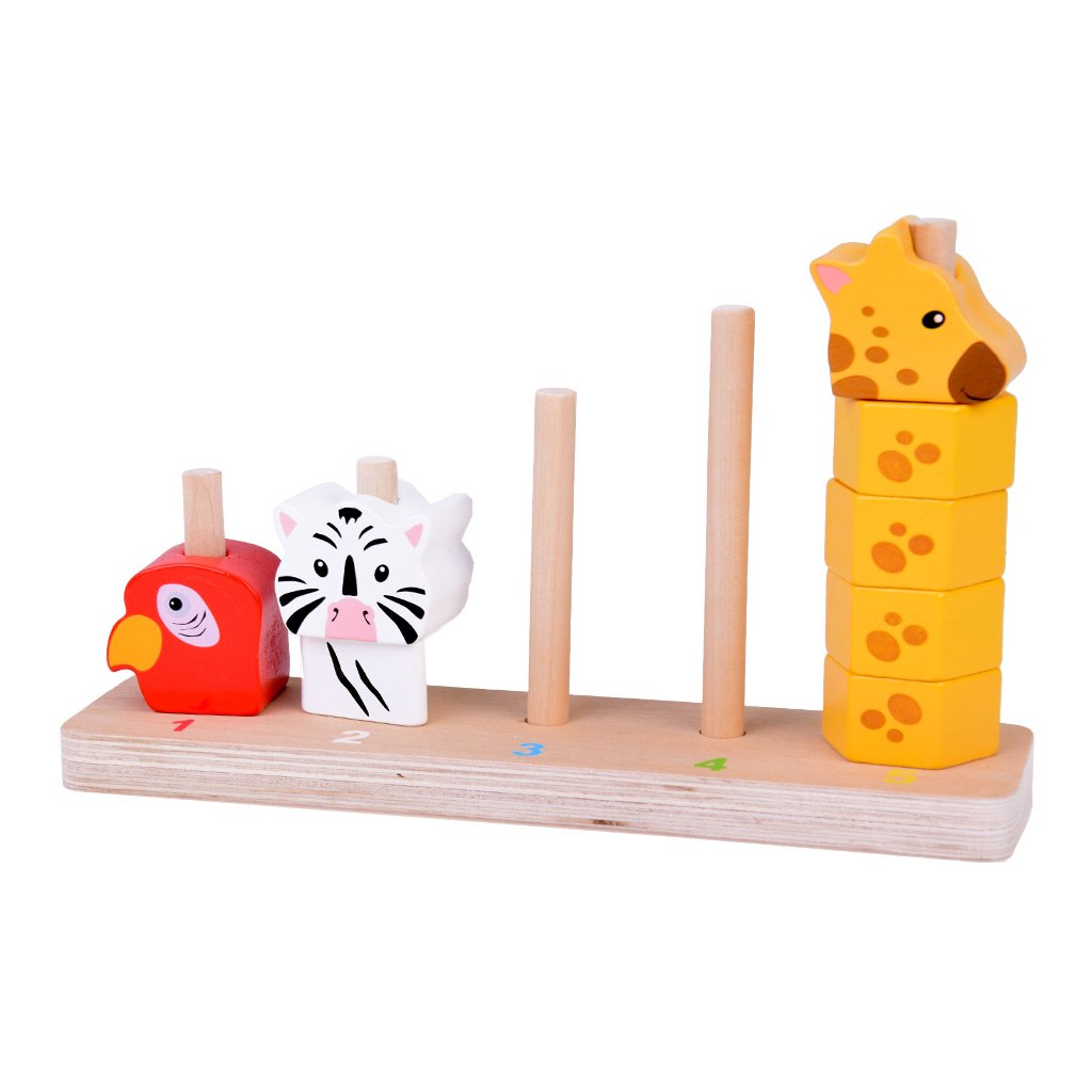 Každé zvieratko má inú farbu – červenú, bielu, modrú, zelenú alebo žltú – a je zložené z rôzneho počtu drevených blokov. Dieťa sa prirodzene učí rozpoznávať farby a tvary pri skladaní pyramídy.