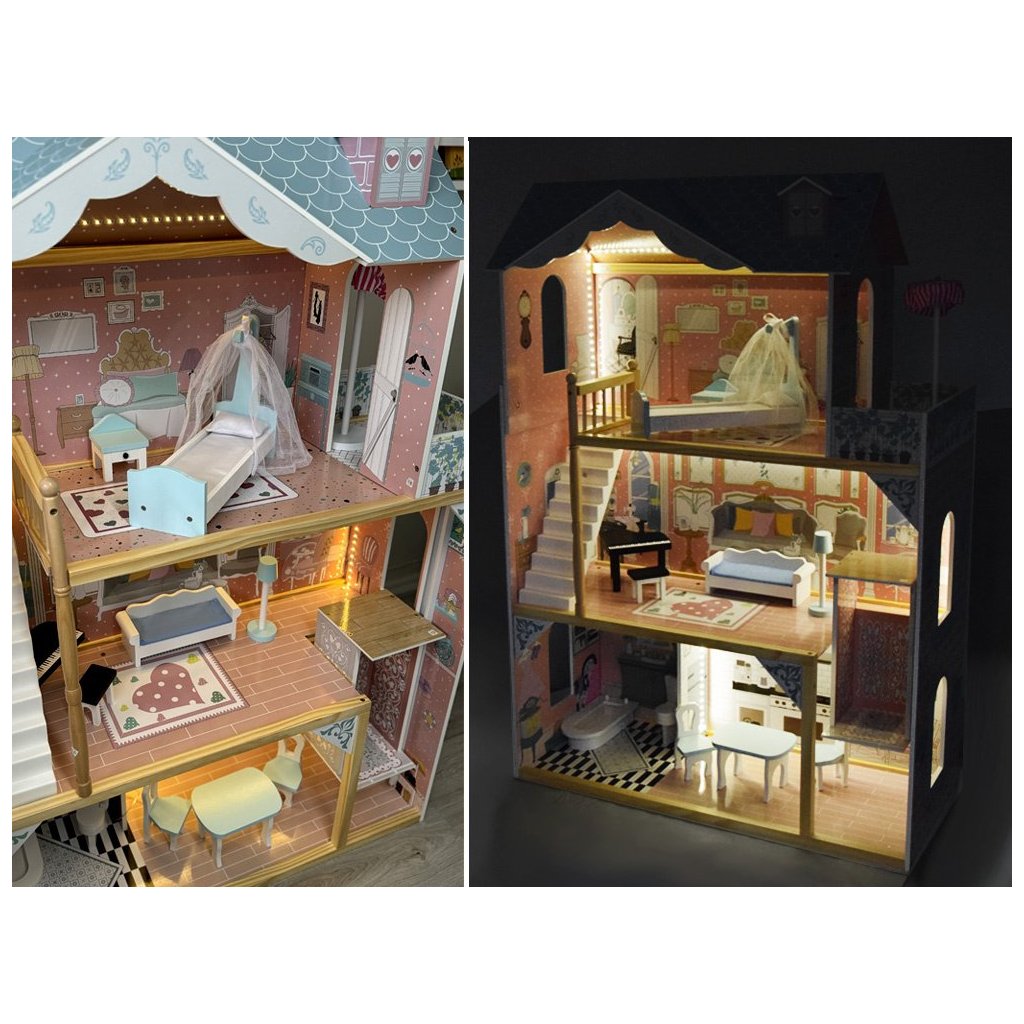 Objavte krásny dvojposchodový drevený domček pre bábiky ZA5458 – veľký, priestranný a plný detailov, ktoré očaria každé dieťa. Tento luxusný domček s nábytkom a LED osvetlením je splneným snom pre všetkých malých milovníkov hier na rodinu.