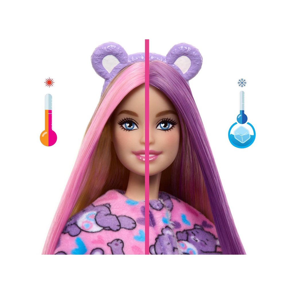 Bábika Barbie je ukrytá v mäkkom, plyšovom kostýme medvedíka. Po vybratí kostýmu odhalíte štýlovú bábiku s jemnými črtami tváre a dlhými vlasmi, pripravenú na úpravu vlasov a zábavu s rozprávaním príbehov.