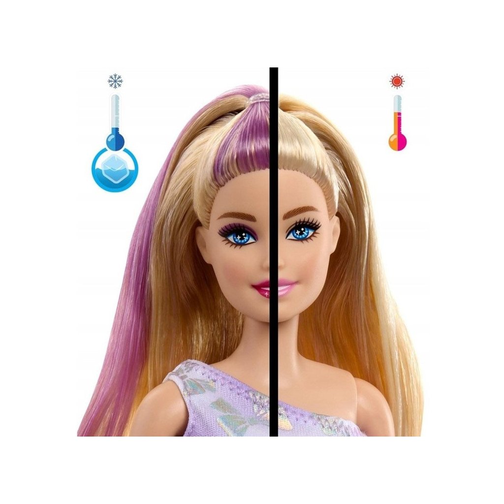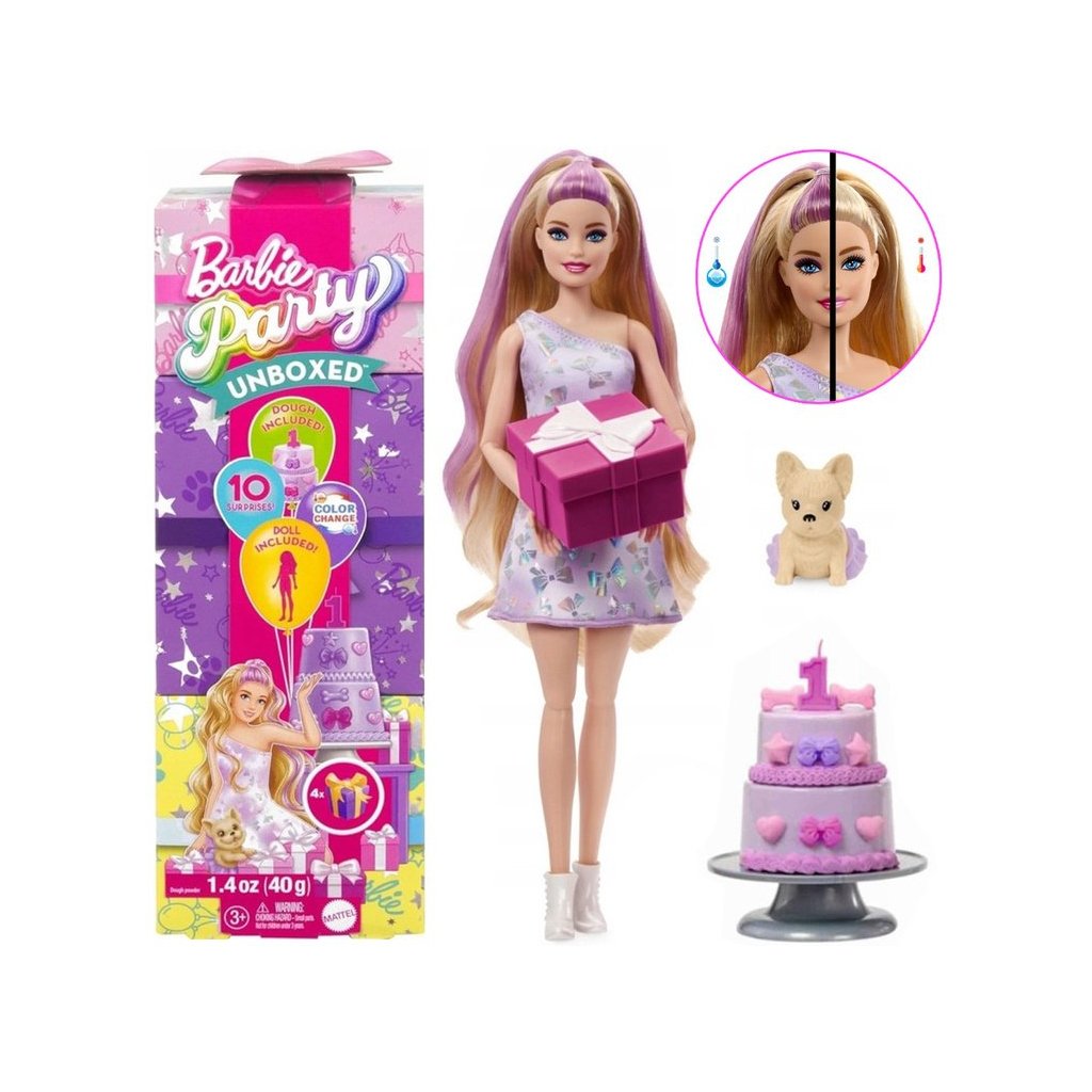 Sada obsahuje funkciu zmeny farby – stačí použiť teplú alebo studenú vodu a na tvári bábiky Barbie® sa objavia detaily oslavy .