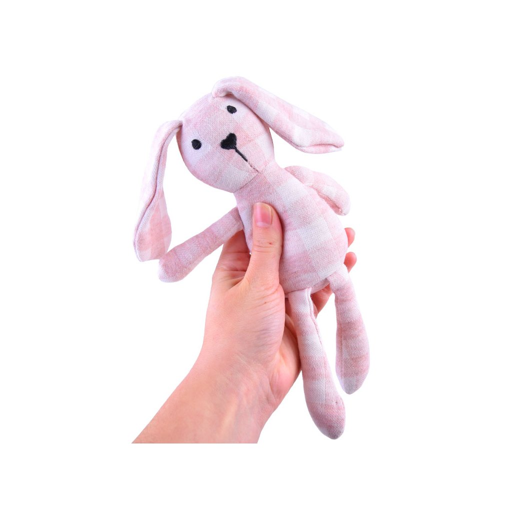 - Plyšový zajačik: 22 cm vysoký, vyrobený z rovnakého materiálu ako šortky bábätka. Má vyšívané očká a špičku, čo mu dodáva rozkošný vzhľad.