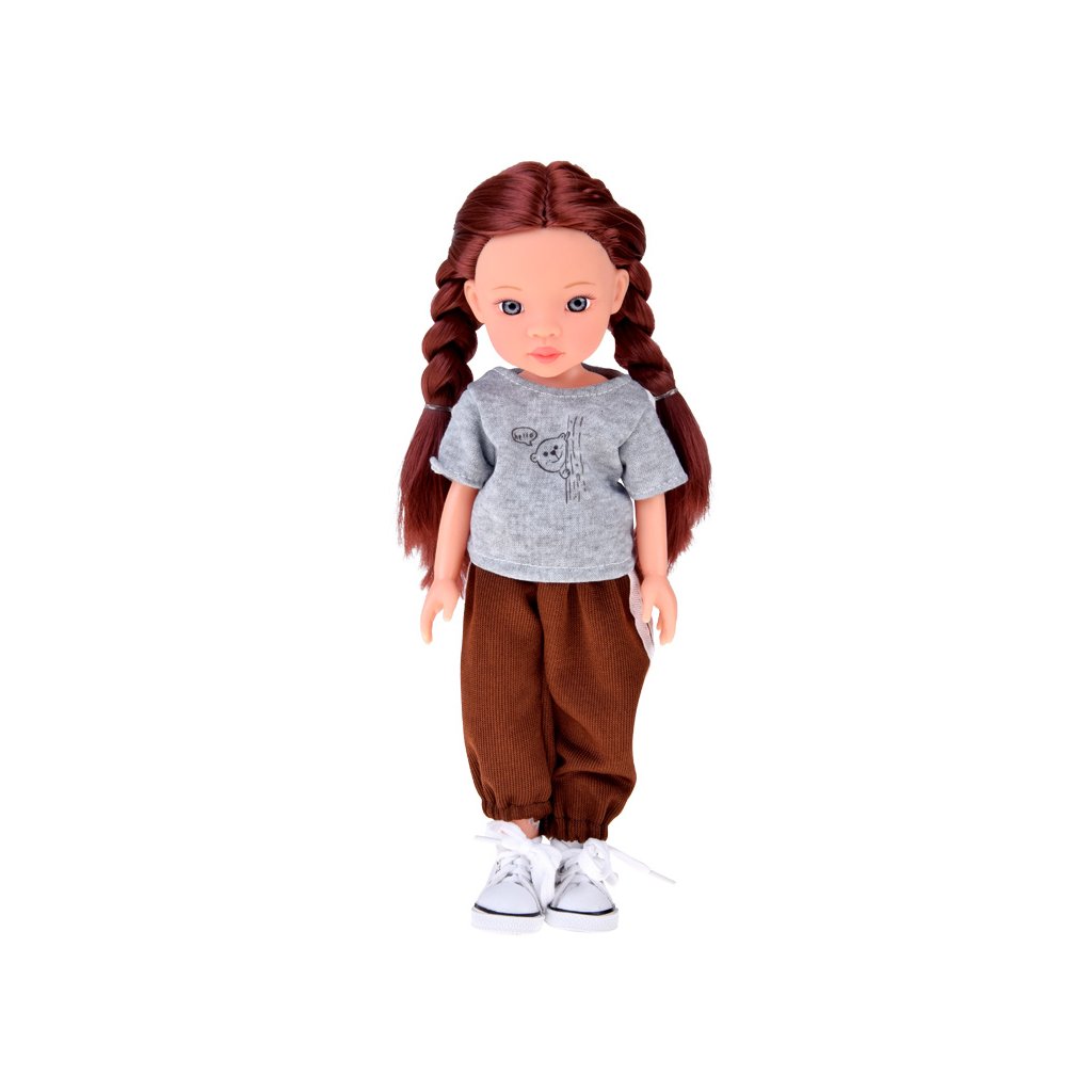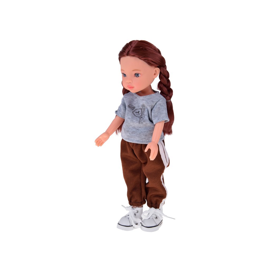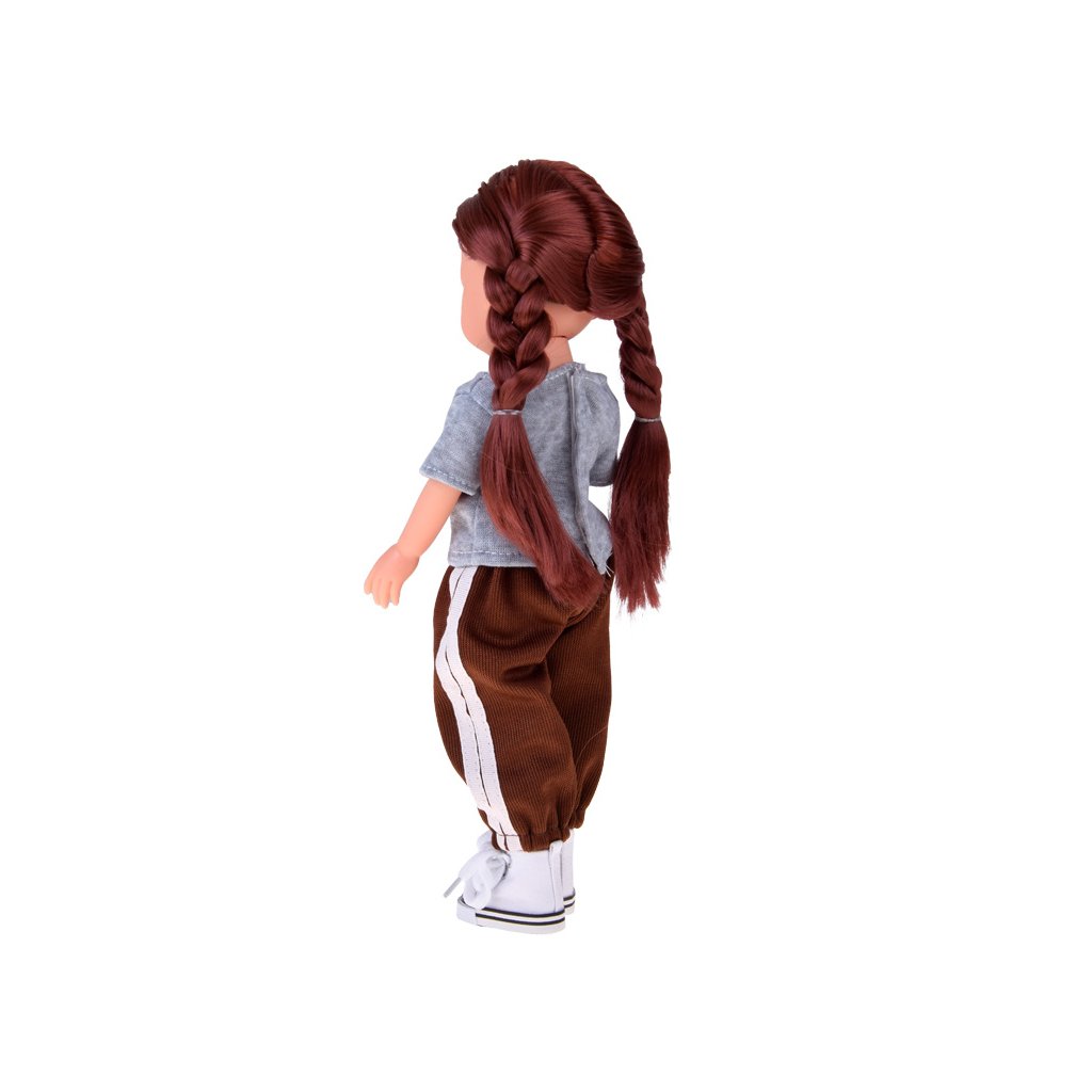 Bábika má dlhé, husté hnedé vlasy, ktoré je možné ľahko česať, zapletať a vytvárať z nich rôzne účesy. Je oblečená v pohodlnom športovom outfite – sivé tričko s potlačou, hnedé tepláky s bielymi pruhmi a biele šnurovacie tenisky. Kombinácia moderného vzhľadu a športového štýlu z nej robí skvelú spoločníčku na každodenné dobrodružstvá.