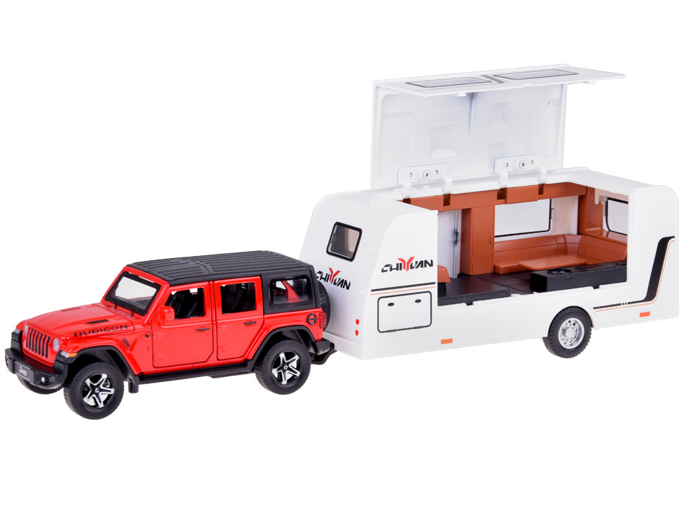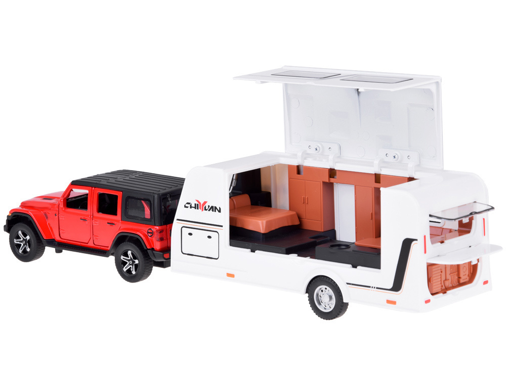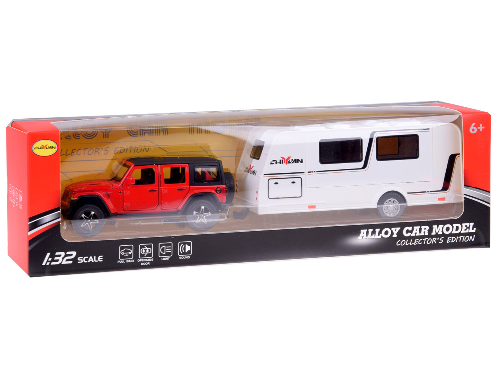 Toto terénne vozidlo s obytným prívesom je perfektnou hračkou na prepravu vášho dieťaťa do sveta prázdninových dobrodružstiev! Kovové terénne vozidlo je vyrobené s neuveriteľnou pozornosťou k detailom a svetlomety, ktoré sa rozsvietia počas jazdy, dodávajú jeho realistický vzhľad. Tento model v mierke 1:32 dokonale replikuje obľúbené SUV a kombinuje odolnosť s vysoko kvalitnou plastovou konštrukciou.