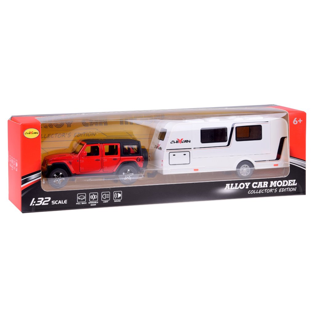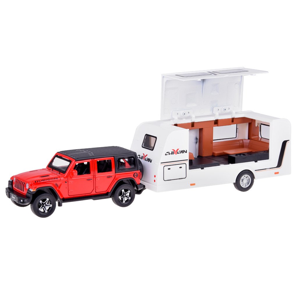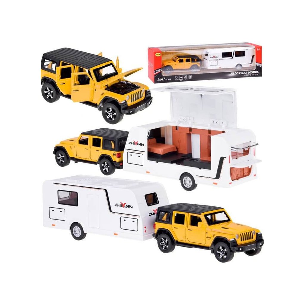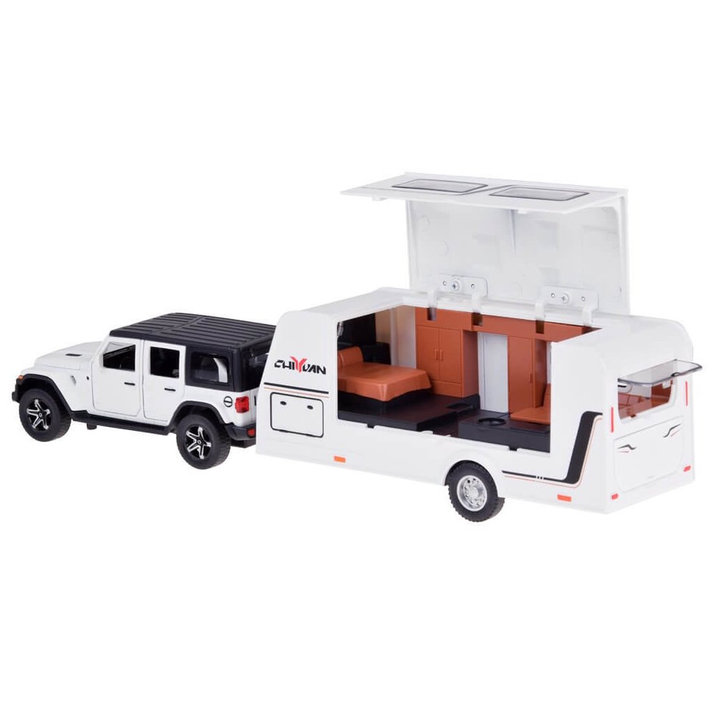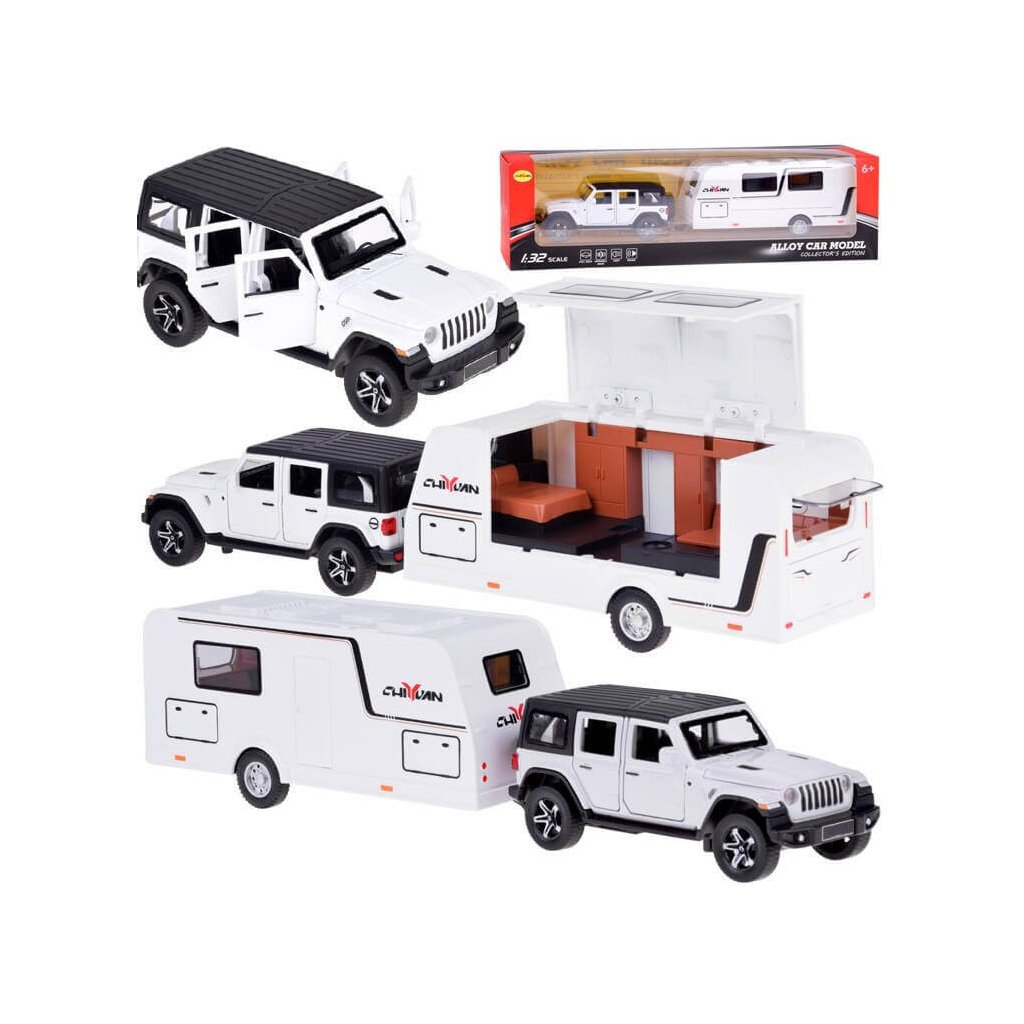 Toto terénne vozidlo s obytným prívesom je perfektnou hračkou na prepravu vášho dieťaťa do sveta prázdninových dobrodružstiev! Kovové terénne vozidlo je vyrobené s neuveriteľnou pozornosťou k detailom a svetlomety, ktoré sa rozsvietia počas jazdy, dodávajú jeho realistický vzhľad. Tento model v mierke 1:32 dokonale replikuje obľúbené SUV a kombinuje odolnosť s vysoko kvalitnou plastovou konštrukciou.