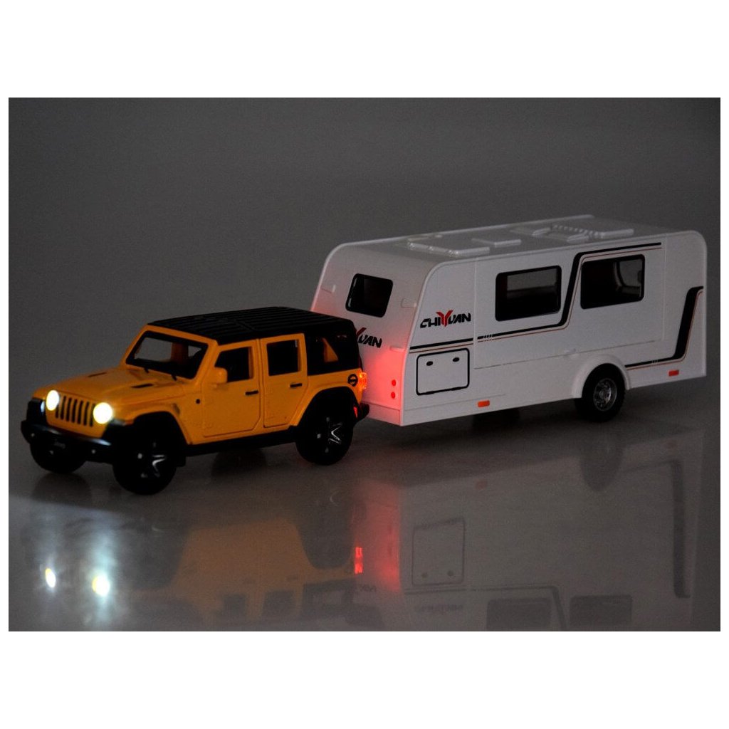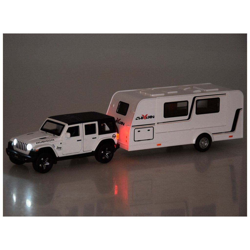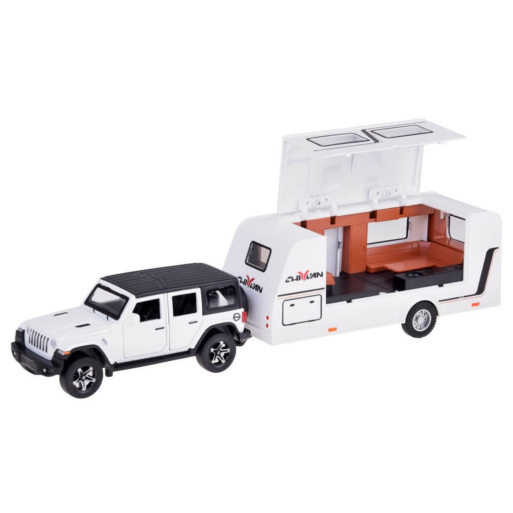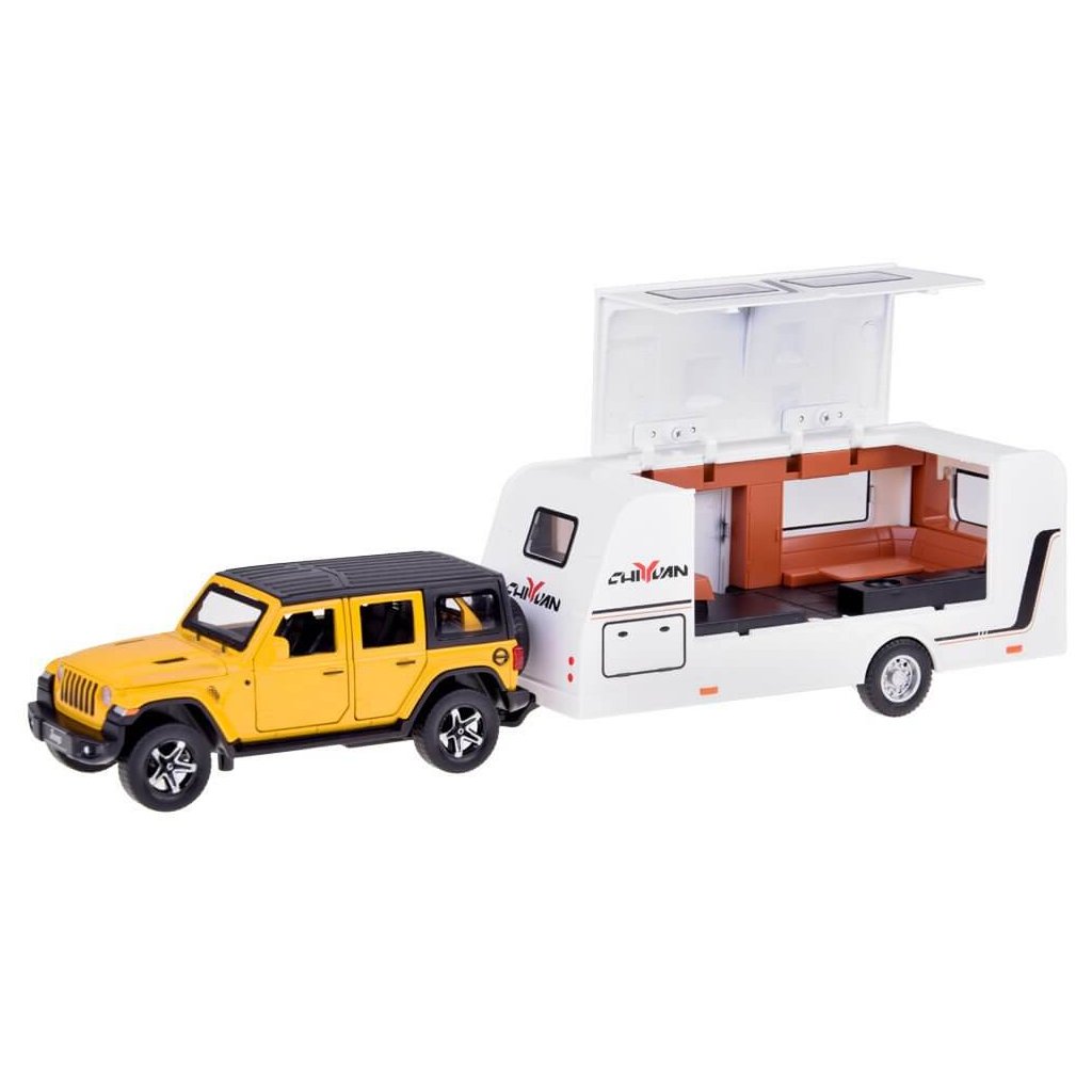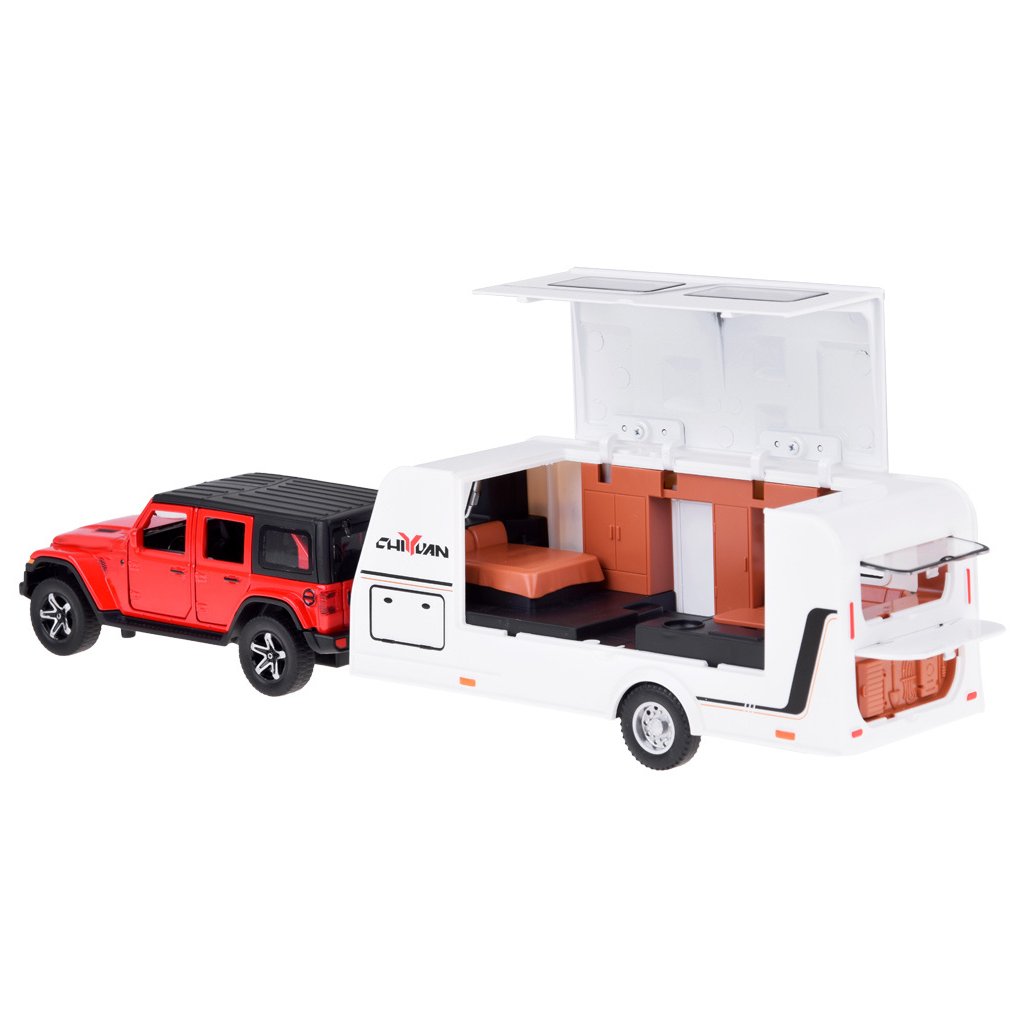 Toto terénne vozidlo s obytným prívesom je perfektnou hračkou na prepravu vášho dieťaťa do sveta prázdninových dobrodružstiev! Kovové terénne vozidlo je vyrobené s neuveriteľnou pozornosťou k detailom a svetlomety, ktoré sa rozsvietia počas jazdy, dodávajú jeho realistický vzhľad. Tento model v mierke 1:32 dokonale replikuje obľúbené SUV a kombinuje odolnosť s vysoko kvalitnou plastovou konštrukciou.