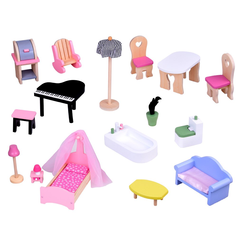 Domček má tri poschodia a sedem detailne prepracovaných miestností – kuchyňu, kúpeľňu, obývačku, spálňu, priestranné balkóny a garáž. V balení nájdete štýlový drevený nábytok, vrátane: