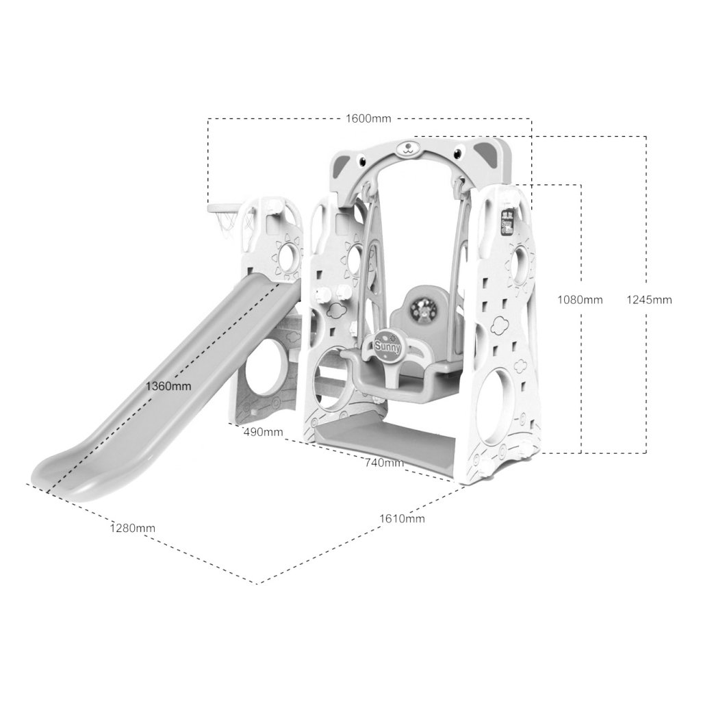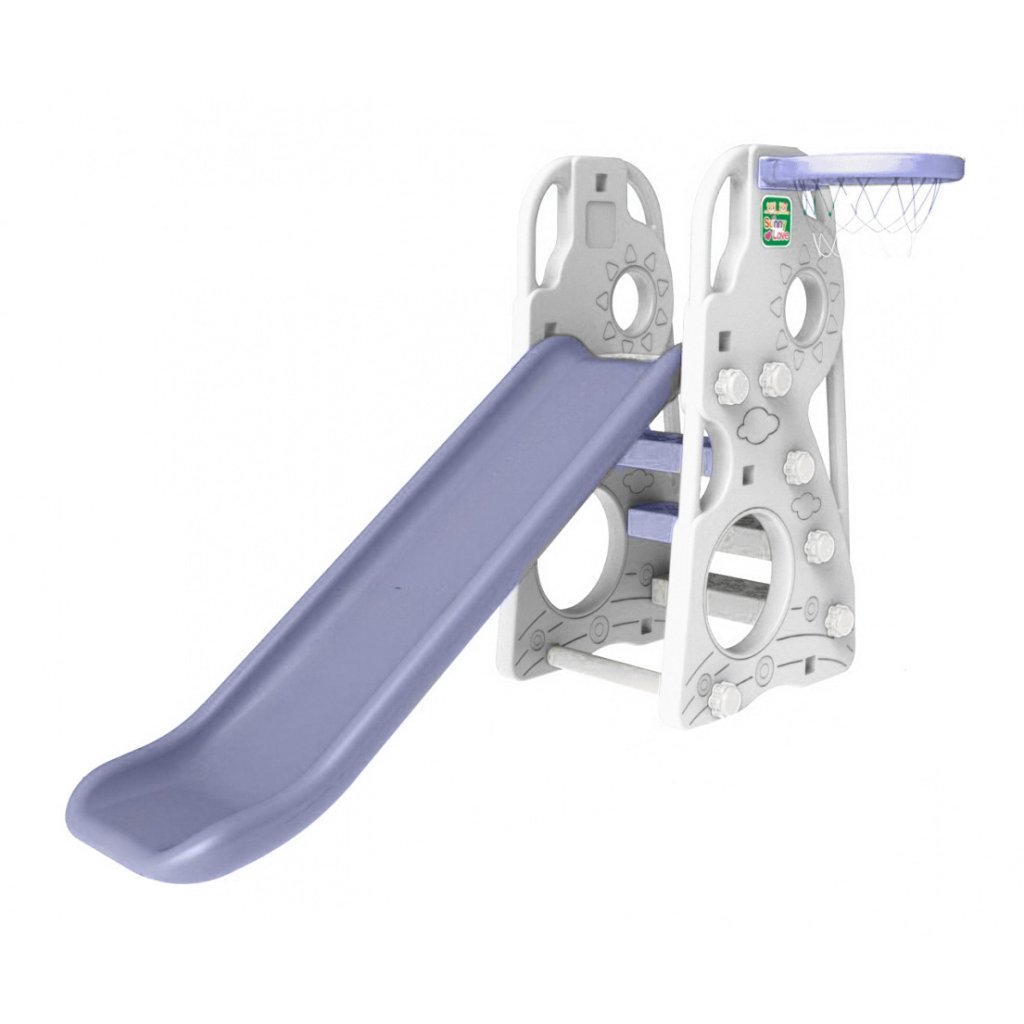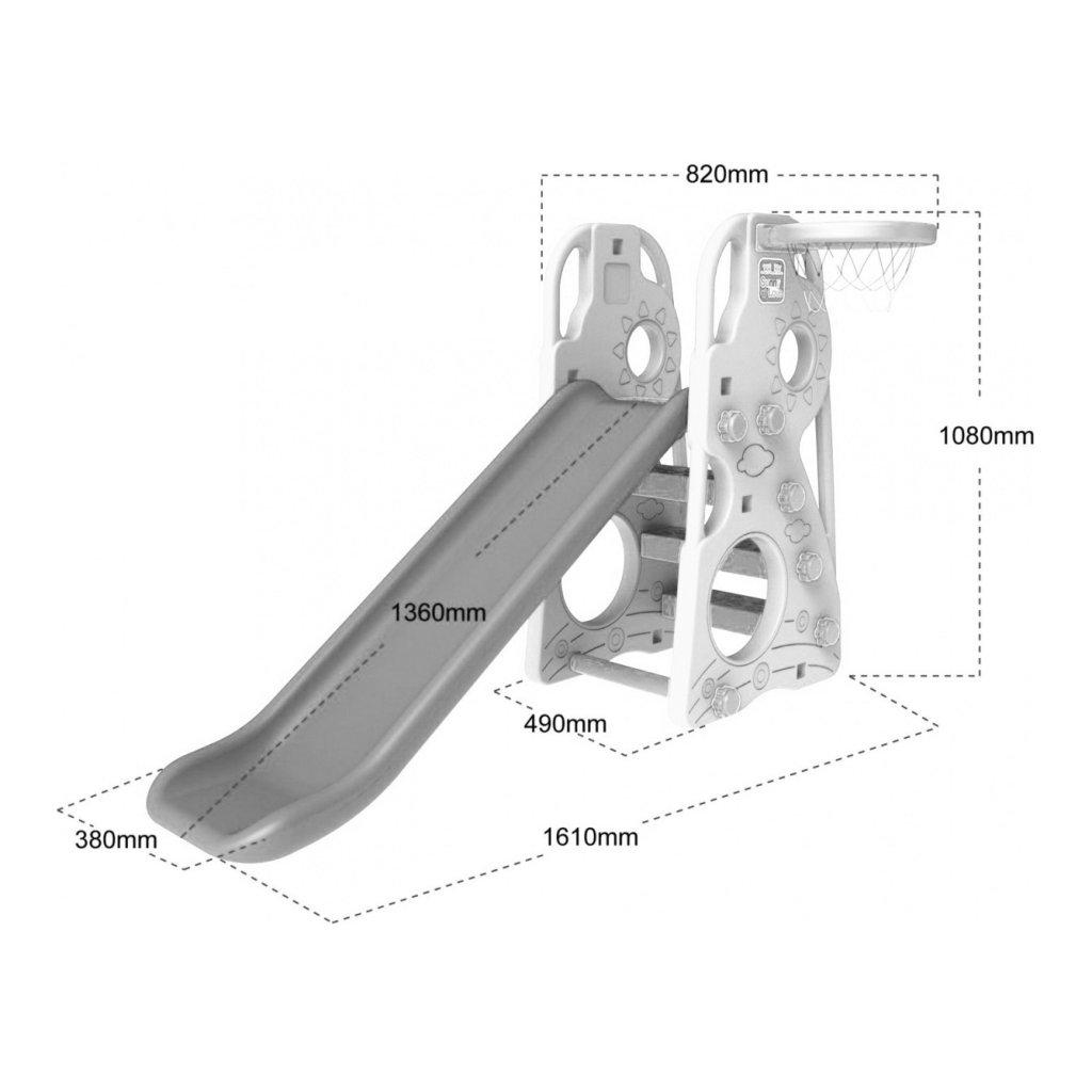 Dlhá sklznica z dvojitého plastu zaisťuje rýchlu a bezpečnú jazdu. Široké, bezpečné schodíky uľahčujú nastupovanie a vystupovanie zo šmykľavky. Basketbalový kôš so sieťou vo výške vhodnej pre deti a loptou poskytujú dodatočnú atrakciu a konštrukcia ihriska umožňuje meniť usporiadanie konštrukcie podľa potrieb užívateľov.