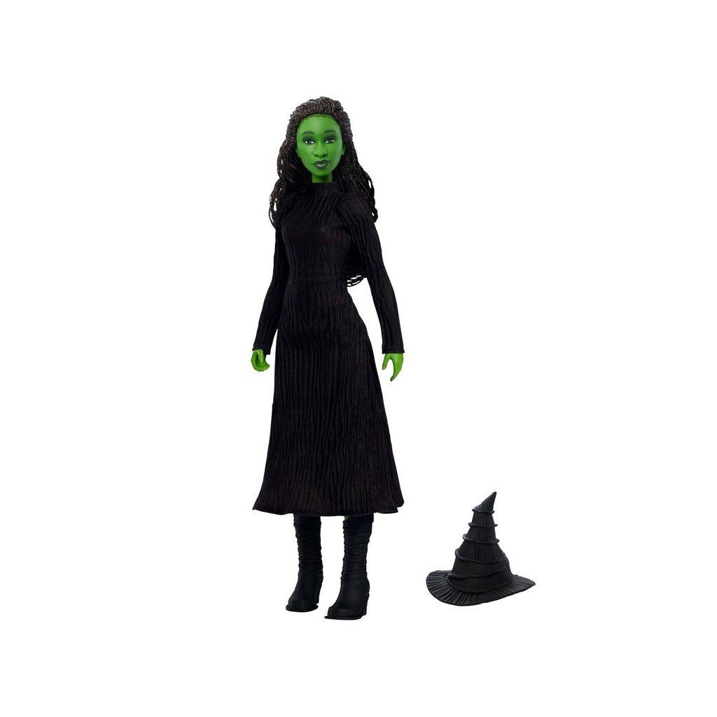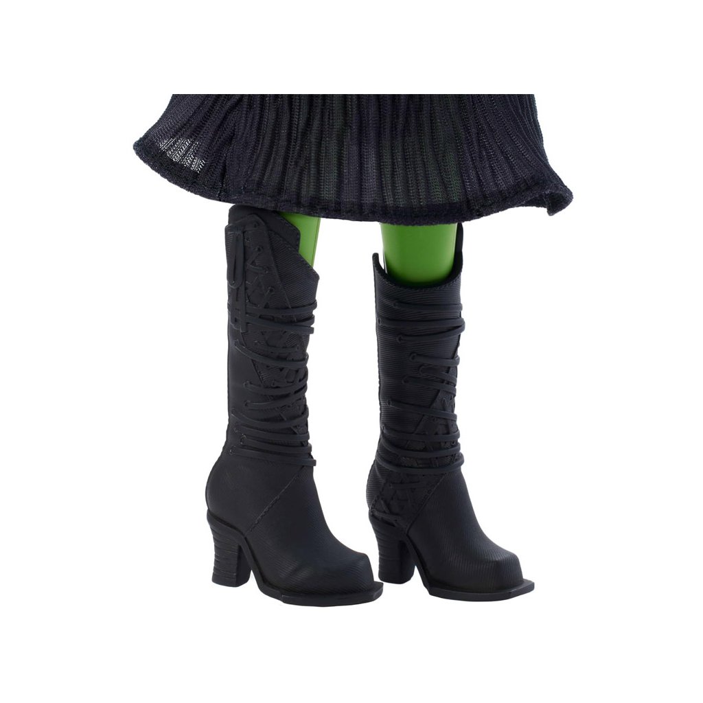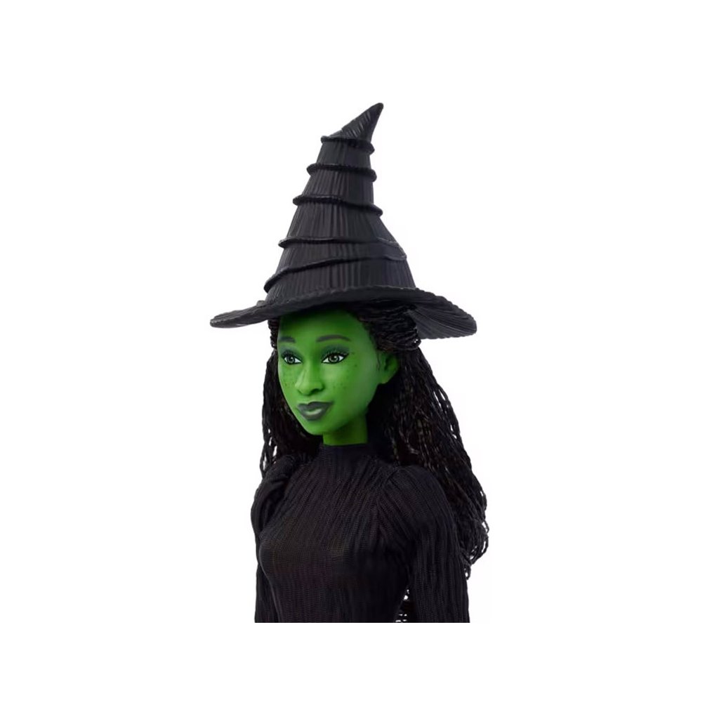 Elphaba je oblečená v elegantných čiernych čipkovaných šatách, ktoré vyzerajú, akoby vystúpila priamo z filmového plátna. Jej ikonický vzhľad dopĺňa odnímateľný čarodejnícky klobúk so širokým okrajom, čierne topánky na vysokých podpätkoch a prepracované vrkoče. Zelený odtieň pleti robí túto bábiku nezameniteľnou a výnimočnou.