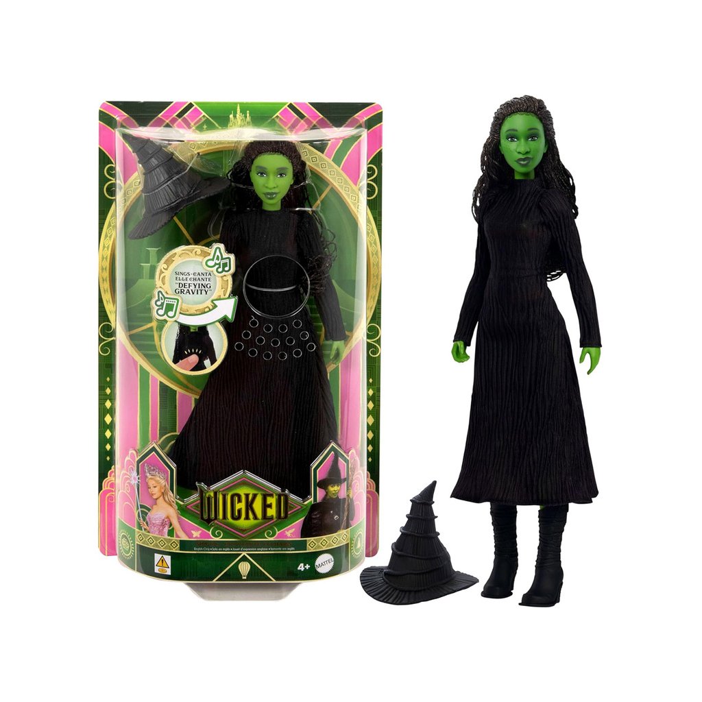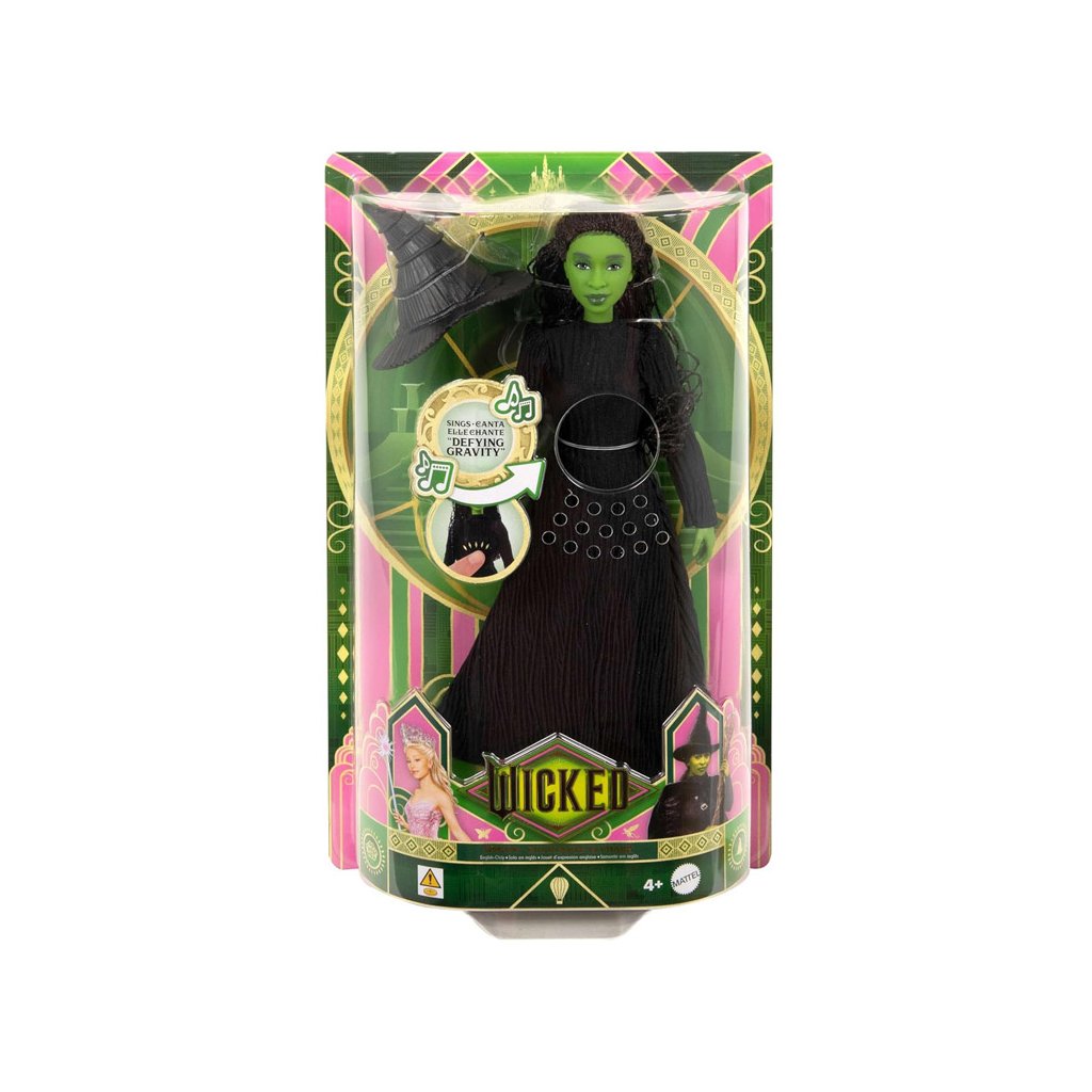 🎶 Spievajúca funkciaBábika je vybavená zvukovým modulom, ktorý po stlačení prehráva ukážku piesne z muzikálu Wicked. Vďaka tomu si fanúšikovia môžu vychutnať kúsok čarovnej atmosféry priamo doma.