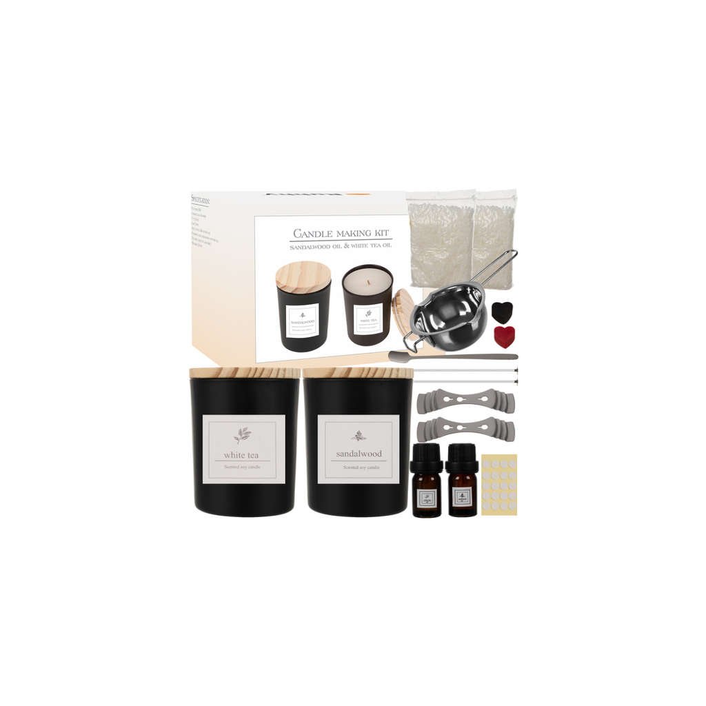 36v1 - táto veľká sada má až 36 prvkov. Umožňuje vám vytvoriť 2 kompletné sviečky. Sada obsahuje: 2x dóza s viečkom na opakované použitie; 2x nálepky na poháre; 2x parfumované oleje; 2x bavlnené knôty; 2x vrecúška vosku; 2x hnetače vosku; 1x nádoba na tavenie vosku; 1x čajová lyžička; 20x nálepky s okrúhlym knôtom; 2x farbivo.