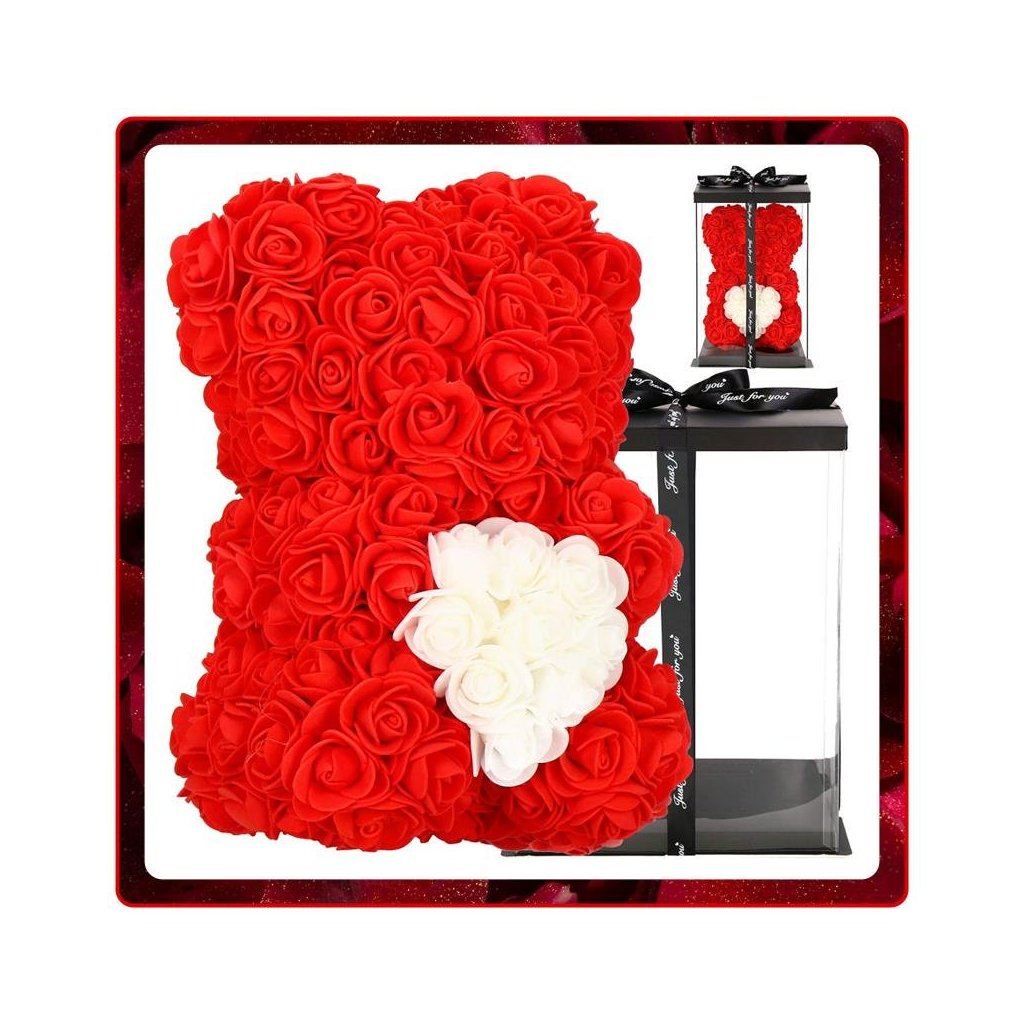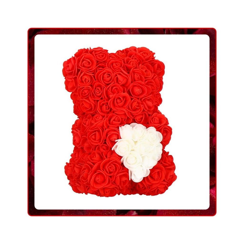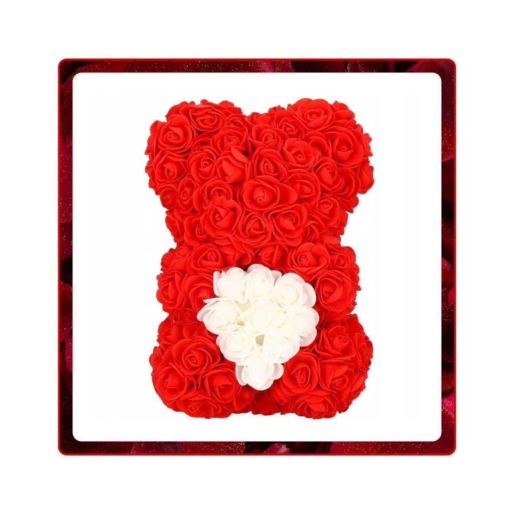 Darujte lásku, ktorá nikdy nezvädne – náš roztomilý medvedík z ružových lupeňov je perfektným darčekom pre každú príležitosť. Tento originálny medvedík je vyrobený z jemných, detailne tvarovaných umelých ruží v odtieňoch červenej a doplnený bielym plyšovým srdcom, ktoré symbolizuje čistú lásku a náklonnosť.