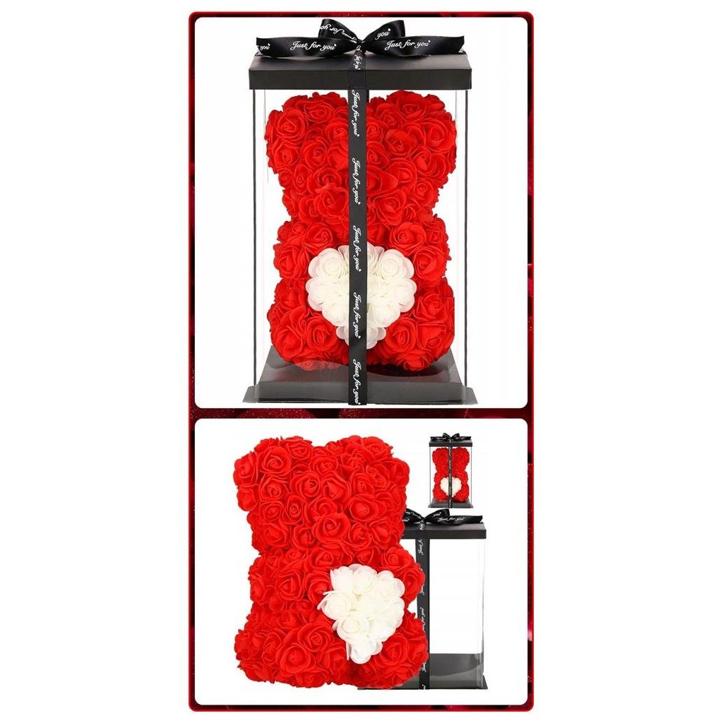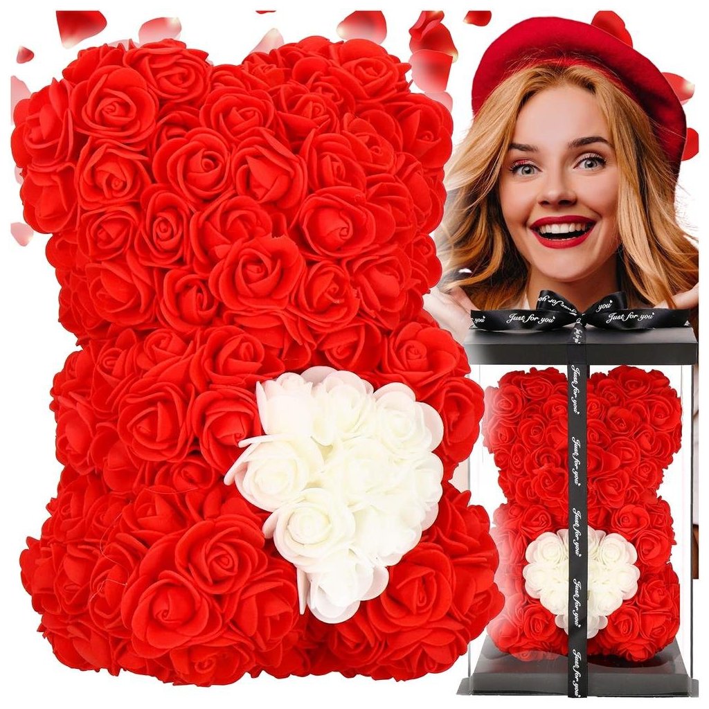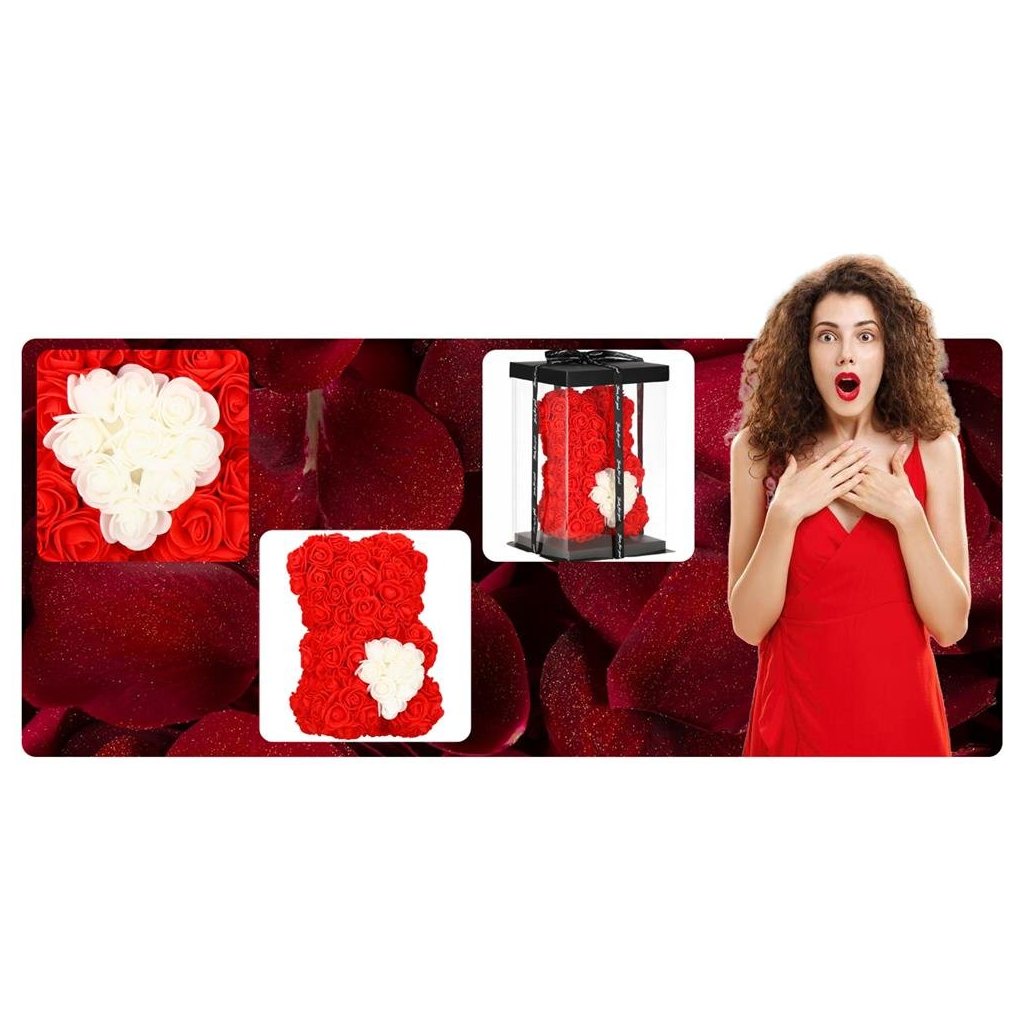 Darujte lásku, ktorá nikdy nezvädne – náš roztomilý medvedík z ružových lupeňov je perfektným darčekom pre každú príležitosť. Tento originálny medvedík je vyrobený z jemných, detailne tvarovaných umelých ruží v odtieňoch červenej a doplnený bielym plyšovým srdcom, ktoré symbolizuje čistú lásku a náklonnosť.