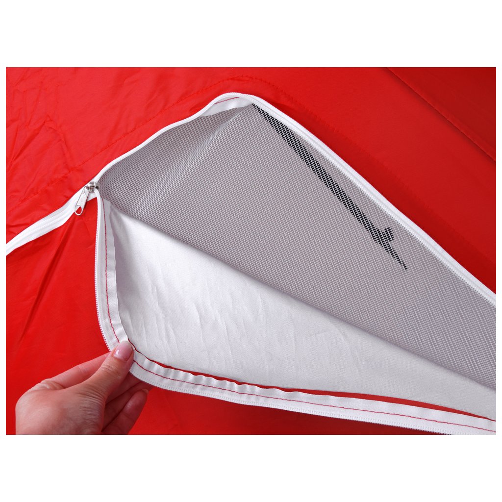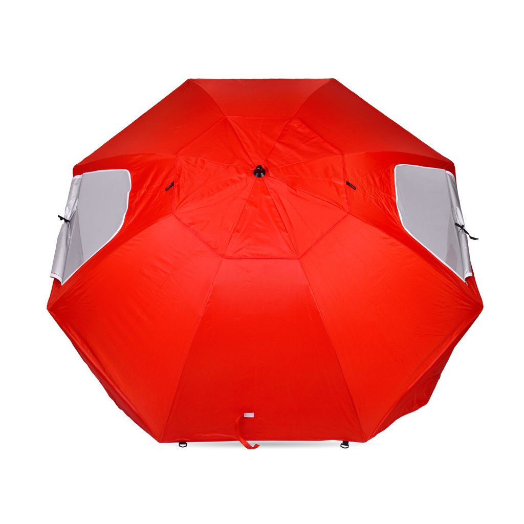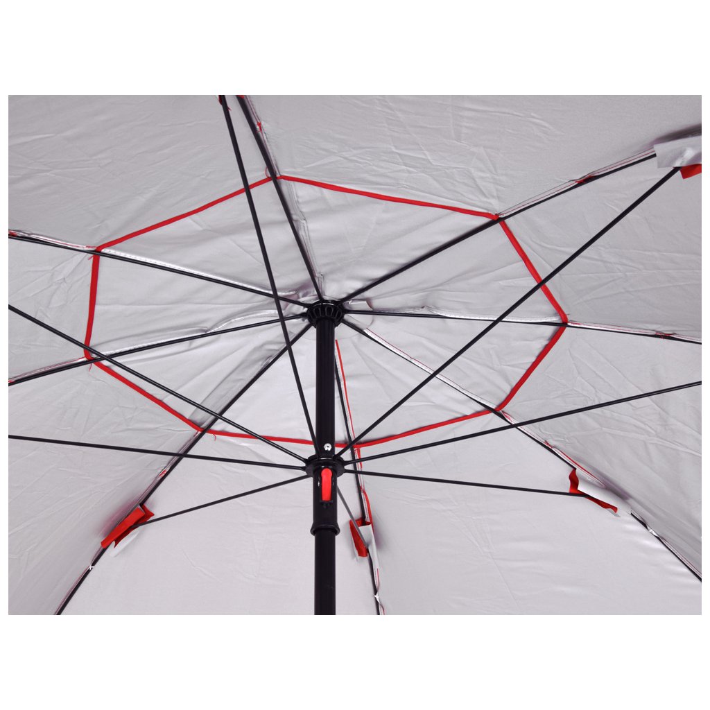 Dáždnik je vyrobený z najkvalitnejších materiálov, čo zaručuje jeho odolnosť a spoľahlivosť. Vybavený pevným rámom a polyesterom s ochranným strieborným náterom účinne chráni pred UV žiarením a nepriaznivými poveternostnými podmienkami. Dáždnik má dve okná s moskytiérou a vetracími otvormi, ktoré zabezpečujú výbornú cirkuláciu vzduchu. Vnútorné vrecká navyše umožňujú uloženie nápojov, jedla a iných drobností.