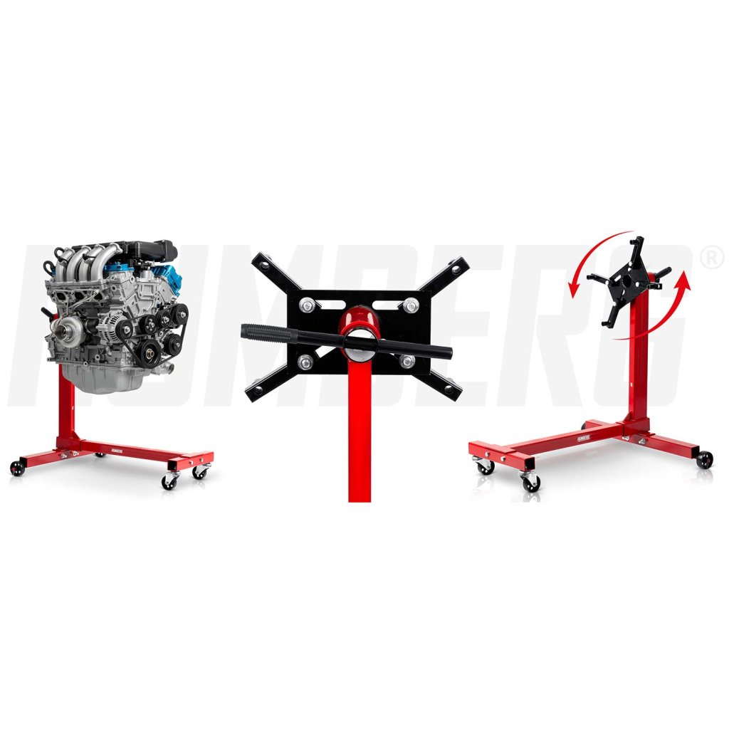 Pevný a robustný stojan od značky Humberg, určený pre montáž, demontáž, opravy a údržbu motorov automobilov. Umožňuje bezpečne držať motor až do 450 kg a otáčať ho o 360° pre jednoduchý prístup ku všetkým komponentom bez potreby jeho vyklápania.