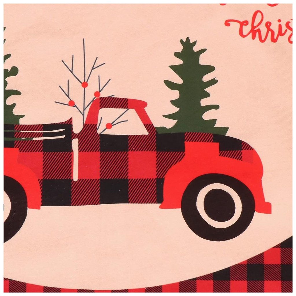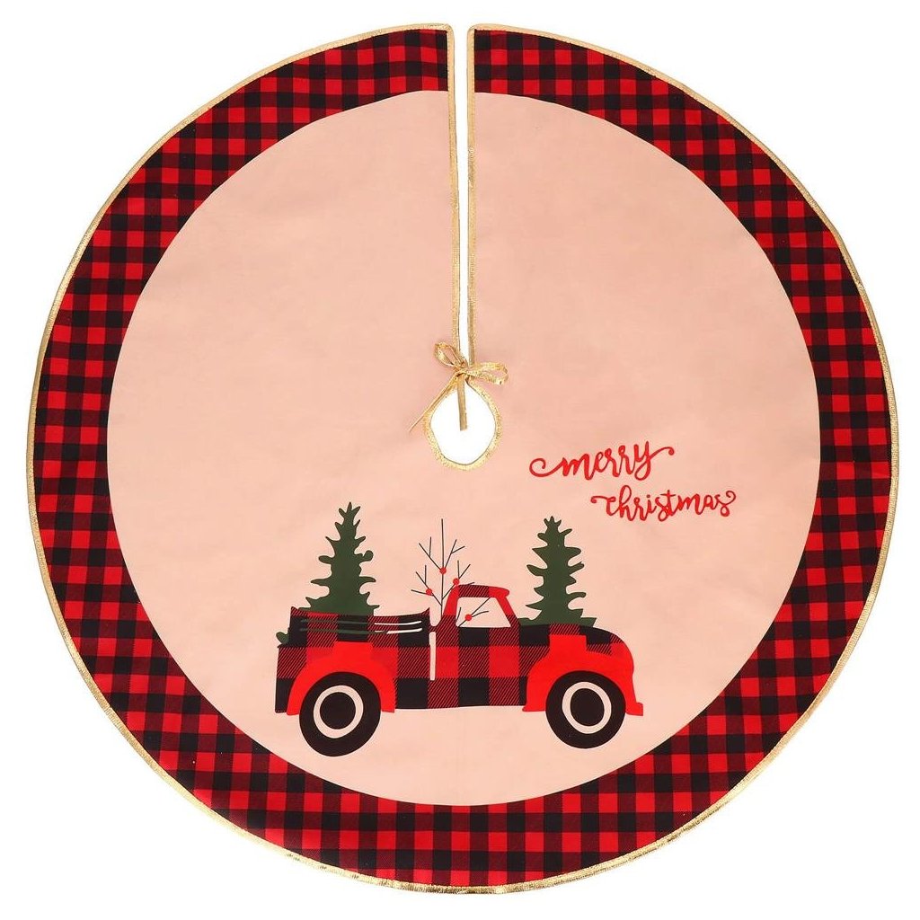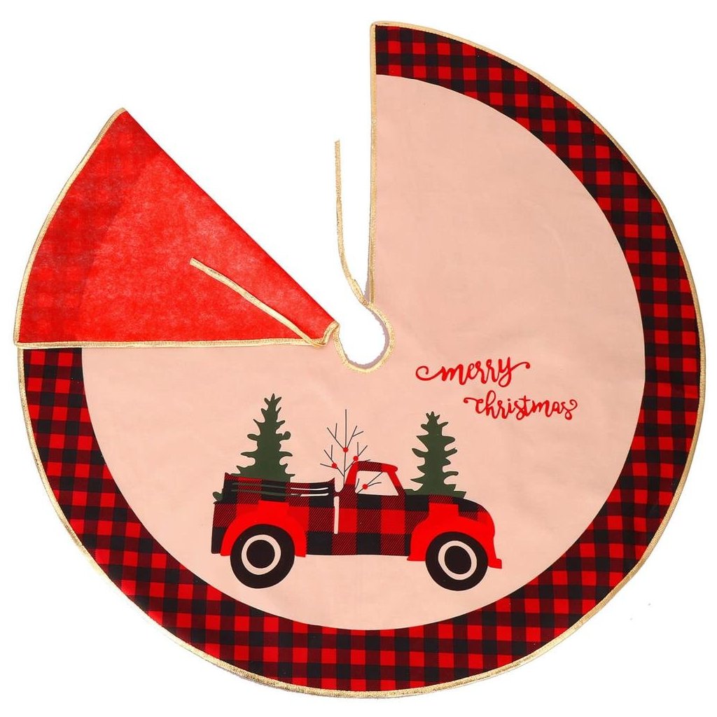 Podložka je navrhnutá v elegantnom vzore červeno-čiernej kocky so zlatým okrajom, doplnená o krásny nápis „Veselé Vianoce“. Zapínanie na šnúrku umožňuje jednoduché upevnenie okolo stojana stromčeka, vďaka čomu perfektne sedí a drží tvar.
