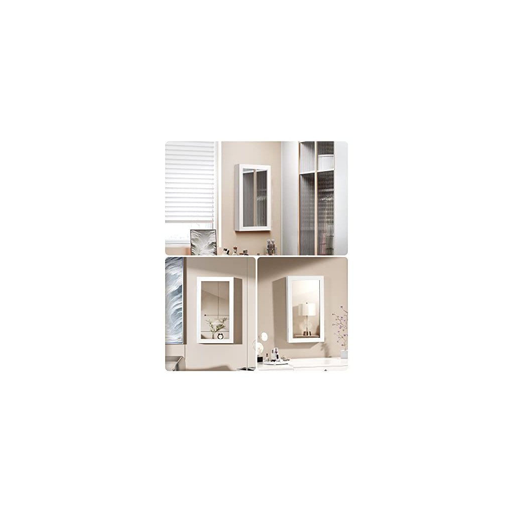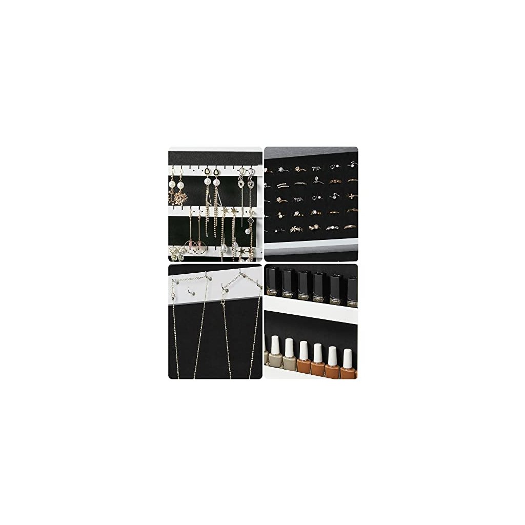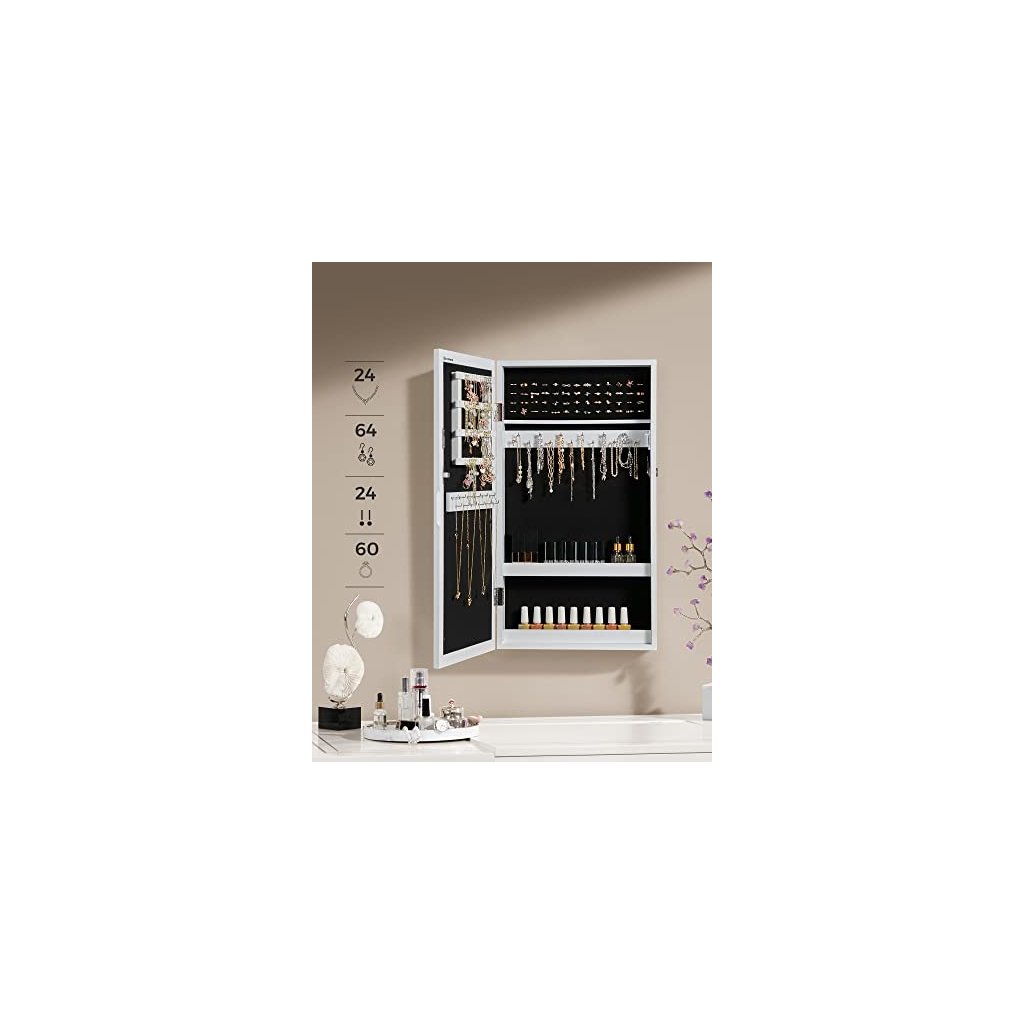 Prijatie nového dizajnu, ktorý kombinuje kozmetické zrkadlo so šperkovnicou, ktoré je pohodlnejšie na použitie. Vyrobené je z ekologického MDF v elegantnom vzhľade s bielym náterom s vynikajúcim úložným priestorom a háčikmi, ktoré dokážu usporiadane uložiť vaše náhrdelníky, náušnice, náramky, hodinky, parfumy, laky na nechty atď. Skrinka je vybavená bočným zámkom a magnetickými dvierkami, aby ste udržali bezpečnosť a poriadok, bez obáv o svoje cennosti.