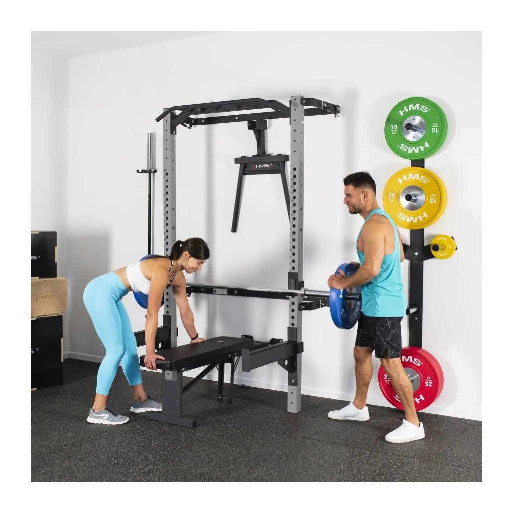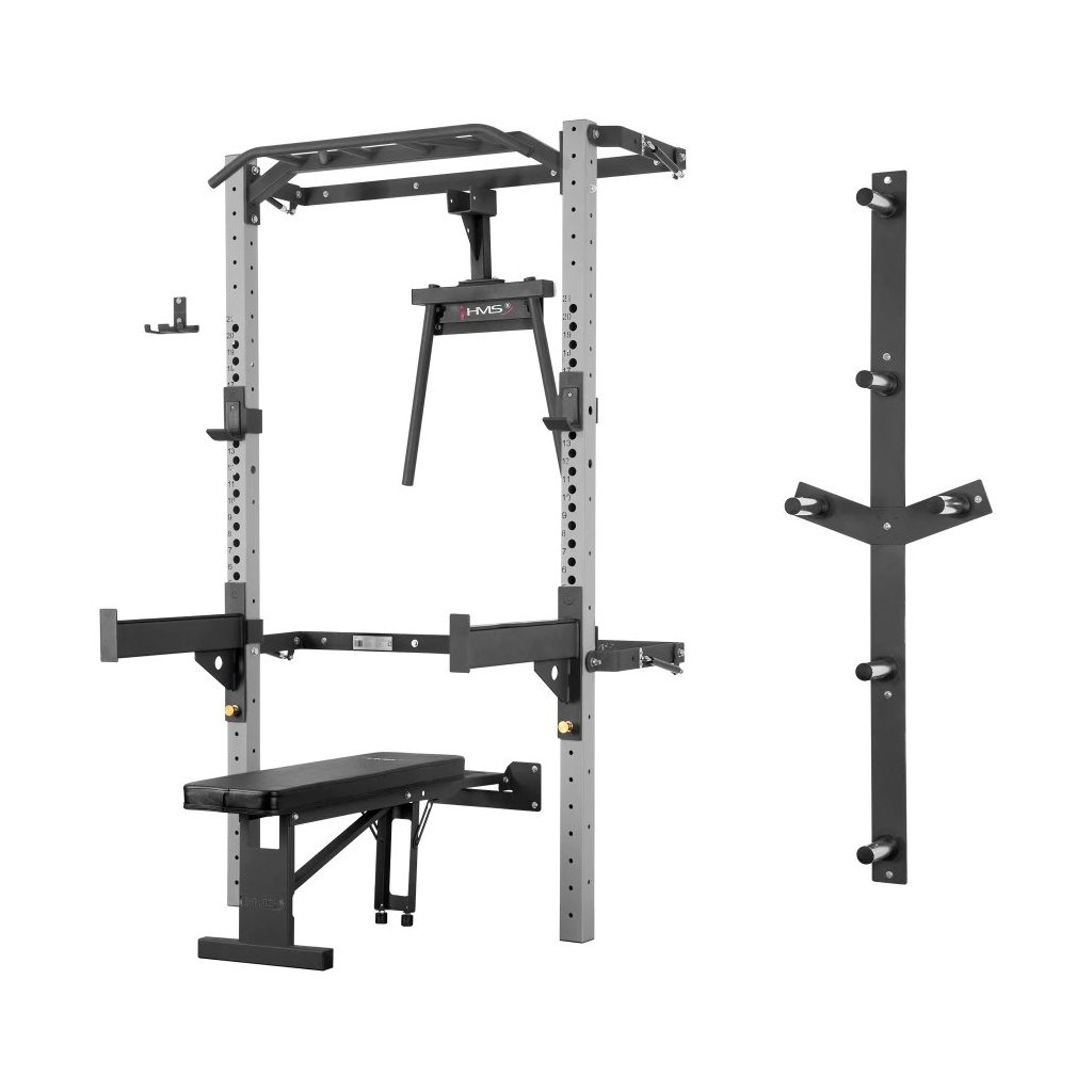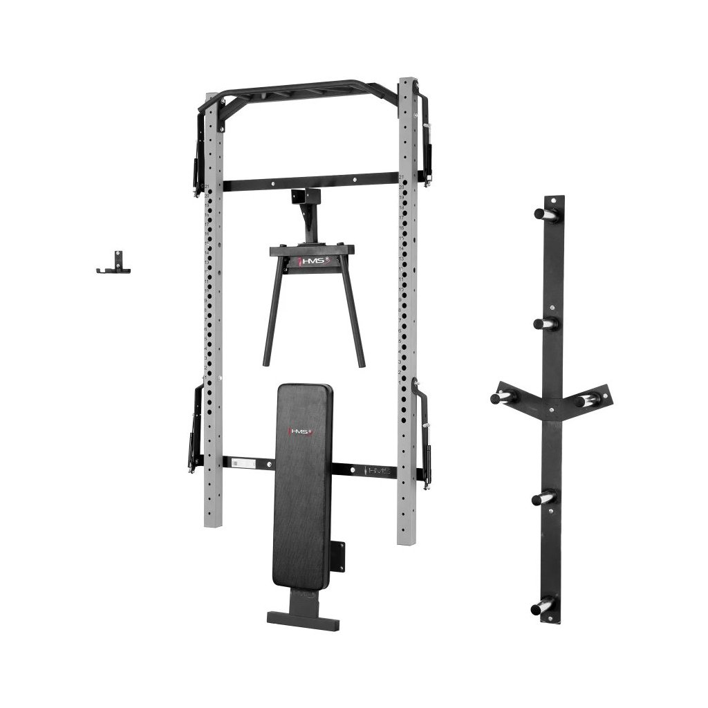 Skladací posilňovací stojan - Power Rack HMS KLT22 bol navrhnutý tak, aby zodpovedal súčasným trendom na trhu a splnil očakávania najnáročnejších zákazníkov. Stojan v tomto variante sa predáva s doplnkovým vybavením. Okrem hrazdy, hákov na činky a bezpečnostných podpier v ňom nájdete aj sklápaciu rovnú lavicu, adaptér na dip, nástenný stojan na kotúče a držiak na osi. Takáto súprava rozšíri vaše možnosti cvičenia a poskytne vám nový úložný priestor pre vaše vybavenie.