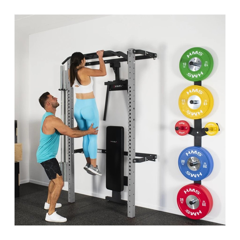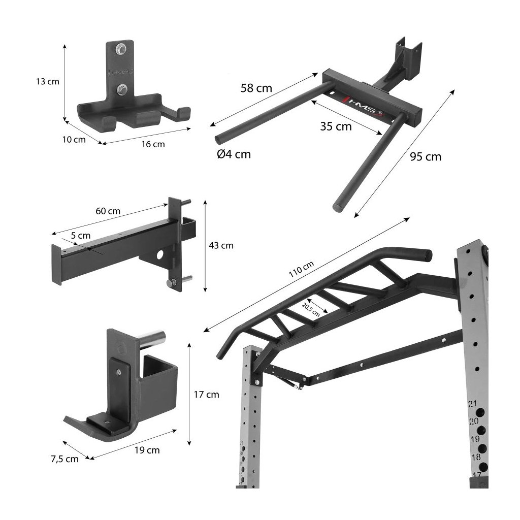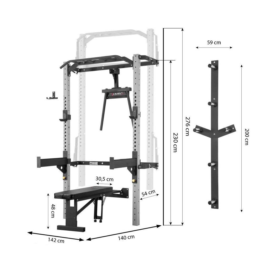 Skladací posilňovací stojan - Power Rack HMS KLT22 bol navrhnutý tak, aby zodpovedal súčasným trendom na trhu a splnil očakávania najnáročnejších zákazníkov. Stojan v tomto variante sa predáva s doplnkovým vybavením. Okrem hrazdy, hákov na činky a bezpečnostných podpier v ňom nájdete aj sklápaciu rovnú lavicu, adaptér na dip, nástenný stojan na kotúče a držiak na osi. Takáto súprava rozšíri vaše možnosti cvičenia a poskytne vám nový úložný priestor pre vaše vybavenie.