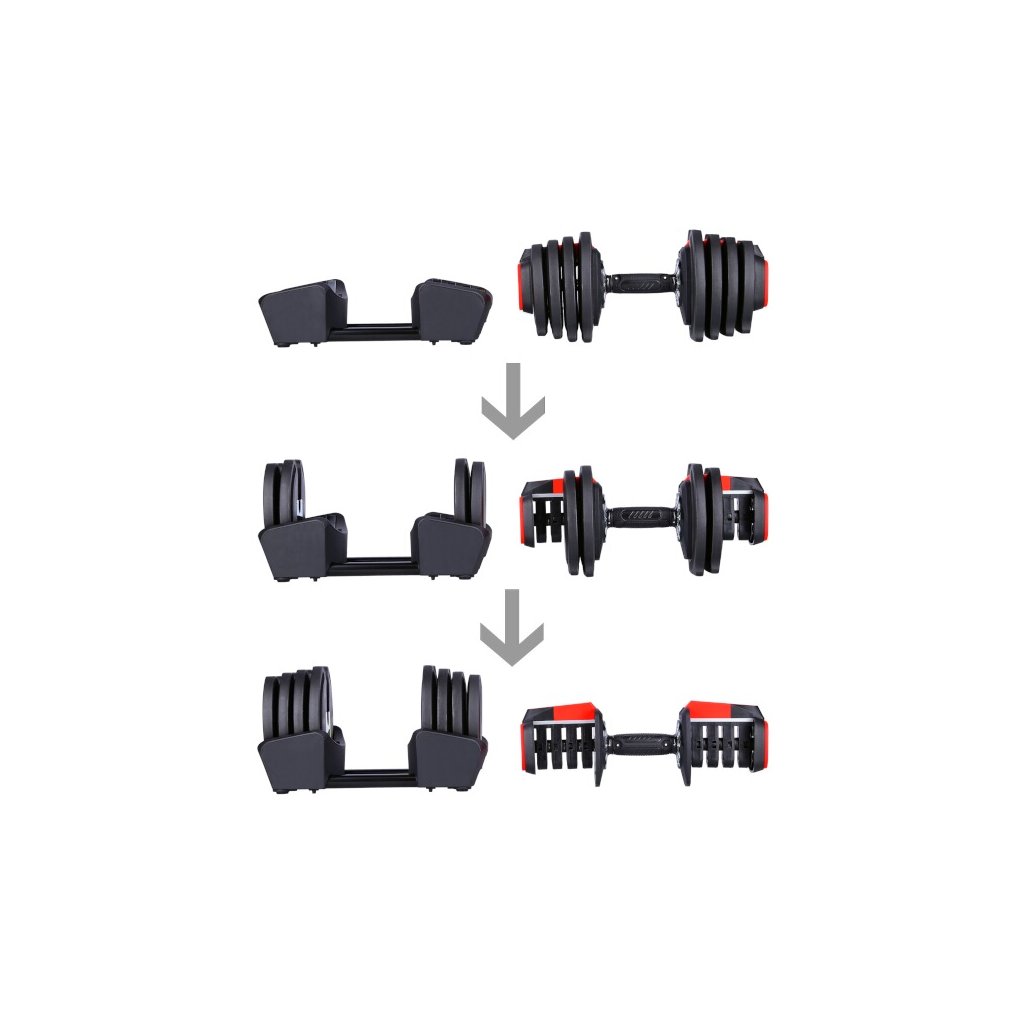 Tréning s jednoručnou činkou umožňuje väčšiu voľnosť pohybu a lepšiu stabilizáciu tela. Cviky môžete vykonávať v rôznych rovinách a smeroch, čo zapája viac svalov a zlepšuje koordináciu. S činkou môžete precvičovať rôzne časti tela, napríklad hrudník, chrbát, ramená, paže, brucho, nohy alebo zadok. Nepotrebujete viac činiek s rôznymi hmotnosťami, stačí jedna, ktorú môžete prispôsobiť svojej úrovni a účelu. V tomto variante možno hmotnosť činky nastaviť na 1,5 - 3 - 6 - 7 - 8 - 9 - 11 - 12 - 13 - 14 - 16 alebo 18 kg. Tieto činky sa dodávajú v balení po 2 kusoch.