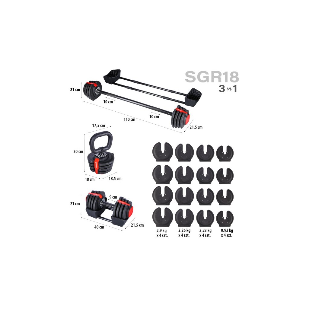 Činka SGR18 má ergonomický tvar a protišmykovú rukoväť, ktorá zaručuje pohodlie a stabilitu. Činku možno zostaviť ako jednoručnú činku, obojručnú činku alebo ako kettlebell. Na tento účel nájdete v balení predlžovací diel (obojručný úchop) s dĺžkou 80 cm, ktorý možno vymeniť za jednoručný úchop, a 2 tyče na predĺženie základne. Okrem toho sú súčasťou balenia 2 rukoväte na použitie závažia ako kettlebell.