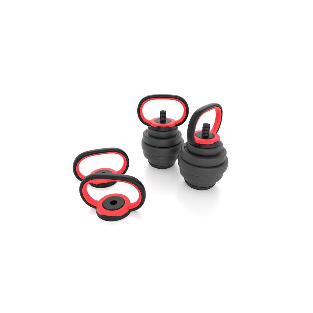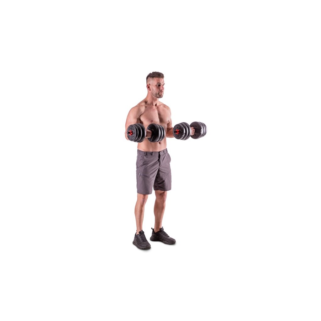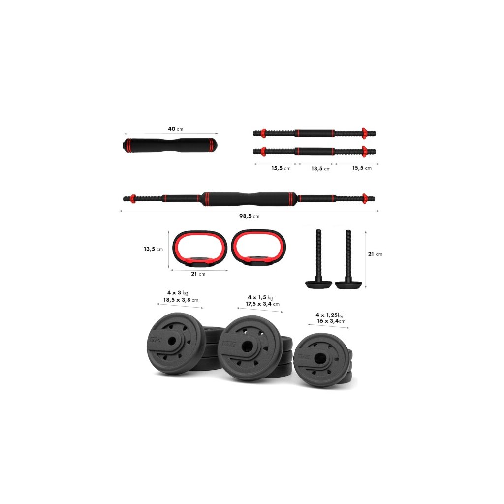 HMS SGX120 Pro je inovatívne riešenie 6v1 pre každú domácu posilňovňu. Základný stavebný prvok tvoria 2 nakladacie jednoručné činky a sada kotúčov. Vďaka širokej škále príslušenstva možno z týchto základných činiek zostaviť obojručnú činku, dva kettlebelly, činku s tromi držadlami, činku s bočným držadlom a stojan na kliky. Činky sú vyrobené z vysokokvalitného a konzistentného kompozitu, ktorý je potiahnutý tvrdým plastom, aby sa zabezpečila ich trvanlivosť a odolnosť voči poškodeniu. Všetky rukoväte a držadlá sú vybavené protišmykovými materiálmi na zabezpečenie pevného úchopu. Spojovací diel je pokrytý ergonomicky tvarovanou penou pre maximálne pohodlie počas tréningu s činkou na chrbte. Nakladacie tyče majú vrúbkovanú rukoväť pre bezpečné uchopenie a závažia sú upevnené pomocou skrutkovacích objímok v tvare hviezdy. Obojručná činka vzniká zaskrutkovaním nakladacích hriadeľov do spojovacieho dielu, výsledná os je dlhá 98 cm a úchopy sú od seba vzdialené 40 až 67 cm. Kettlebell sa skladá z 21 centimetrov dlhého nakladacieho tŕňa, na ktorom sú naskladané kotúče požadovanej hmotnosti, ktoré sú upevnené rukoväti. Ak nahradíme hviezdicové objímky na jednoručných činkách rukoväťami, získame činku s tromi rukoväťami, ktorá je ideálna na tréning, keď je potrebné, aby obe ruky pracovali symetricky, napríklad pri tréningu ramien. Ak nahradíme úchopom iba jednu hviezdicovú objímku, získame činku, ktorú možno použiť ako kettlebell. Samotné rukoväte slúžia ako podpery pre kľuky. Tréning s podperami umožňuje väčší rozsah pohybu a zefektívňuje tréning klikov. SGX je jediná súprava, ktorá vďaka nespočetným možnostiam vybaví celú vašu domácu posilňovňu. Je potrebné ho mať!