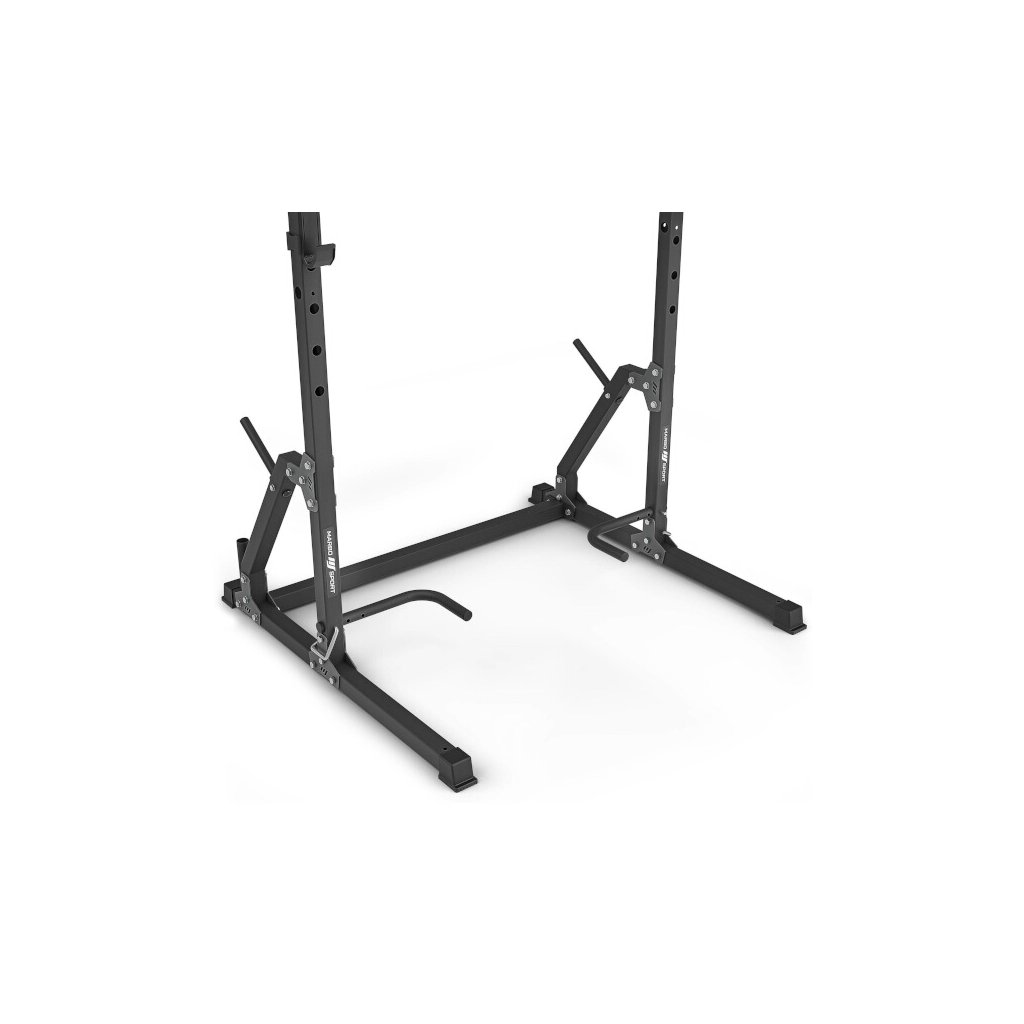 Súčasťou balenia sú 2 oceľové háky na odloženie obojručnej činky. Háky je možné nastaviť do 7 úrovní od 72 do 132 cm. Háky majú kolík, ktorý sa vloží do otvoru v požadovanej výške a potom sa hák otočí, čím sa zaistí. Vďaka gravitácii zostáva hák pevne na mieste, takže sa nemusíte obávať o bezpečnosť ani pri tréningu s veľmi ťažkou činkou. Výškový rozsah hákov je ideálny na tréning s lavičkou. Konštrukcia je kompatibilná s obojručnými činkami, ktoré majú úchopovú časť dlhšiu ako 123 cm.