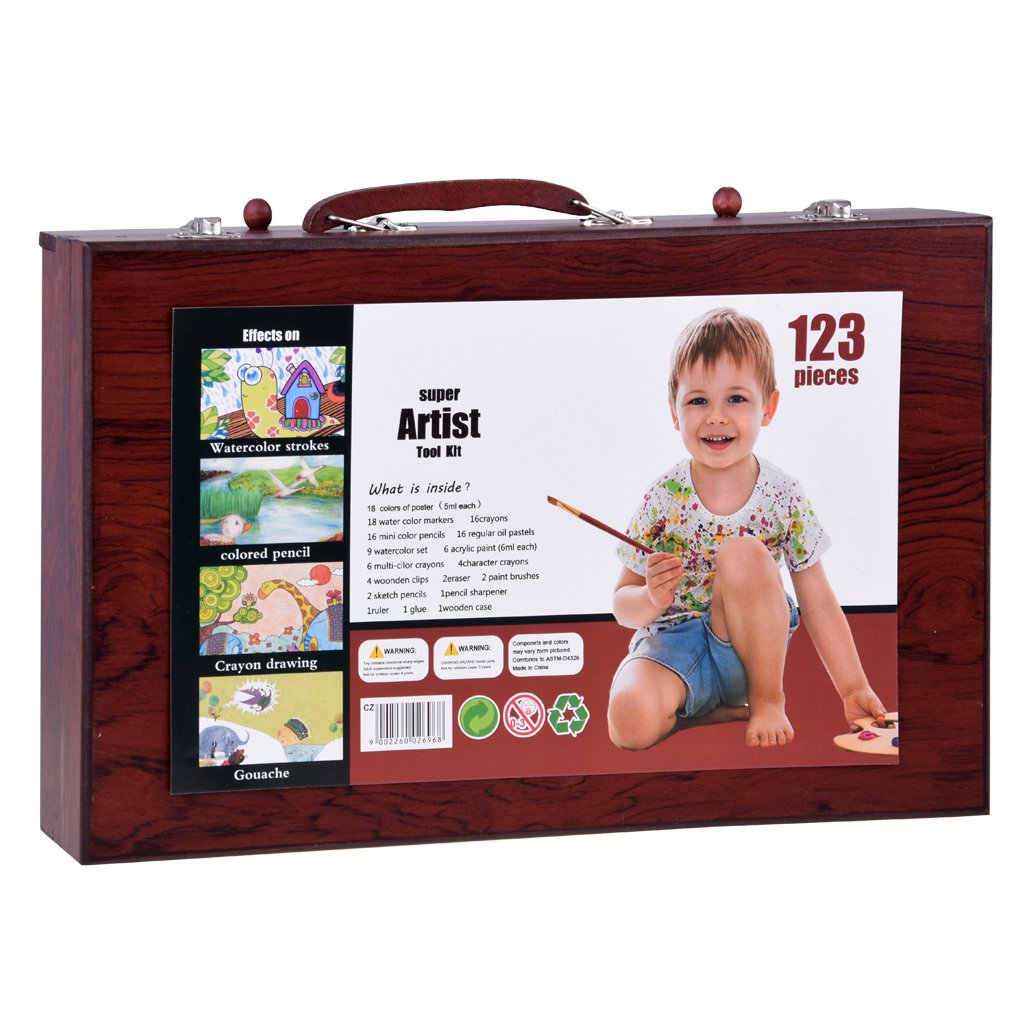 Kompletná výbava – 123 dielov, ktoré pokrývajú rôzne umelecké techniky: skicovanie, maľovanie, pastelky, voskovky aj akvarel.