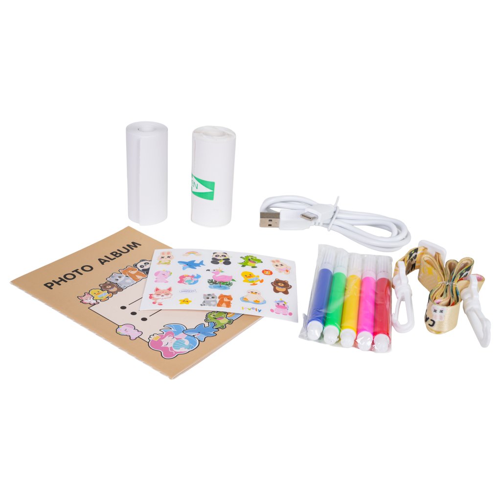 Kompletná darčeková sada – obsahuje 2 termo rolky, šnúrku na krk, 5 farebných pier, nálepky, fotoalbum a nabíjací kábel.
