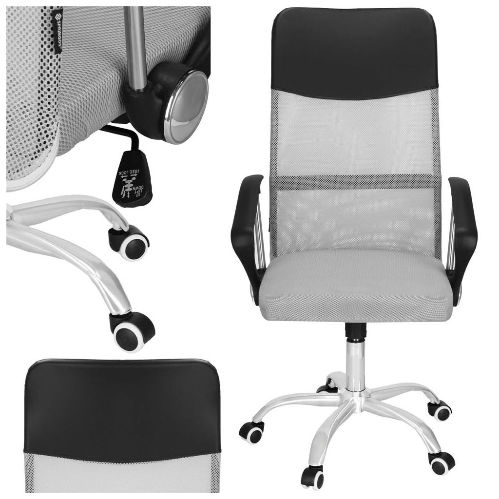 Kancelárska stolička Springos HF0032 je ergonomická, nastaviteľná a pohodlná stolička, ktorá je určená pre dlhé hodiny práce alebo štúdia. Vďaka modernému dizajnu v tlmených farbách (svetlosivá + čierna + chróm) sa hodí do domácej kancelárie aj firemných priestorov. Stolička je vyrobená z kvalitného kovu a potiahnutá ekokožou a látkou, čo zabezpečuje estetický vzhľad aj jednoduchú údržbu. Mäkké sedadlo poskytuje komfort aj pri dlhom sedení.