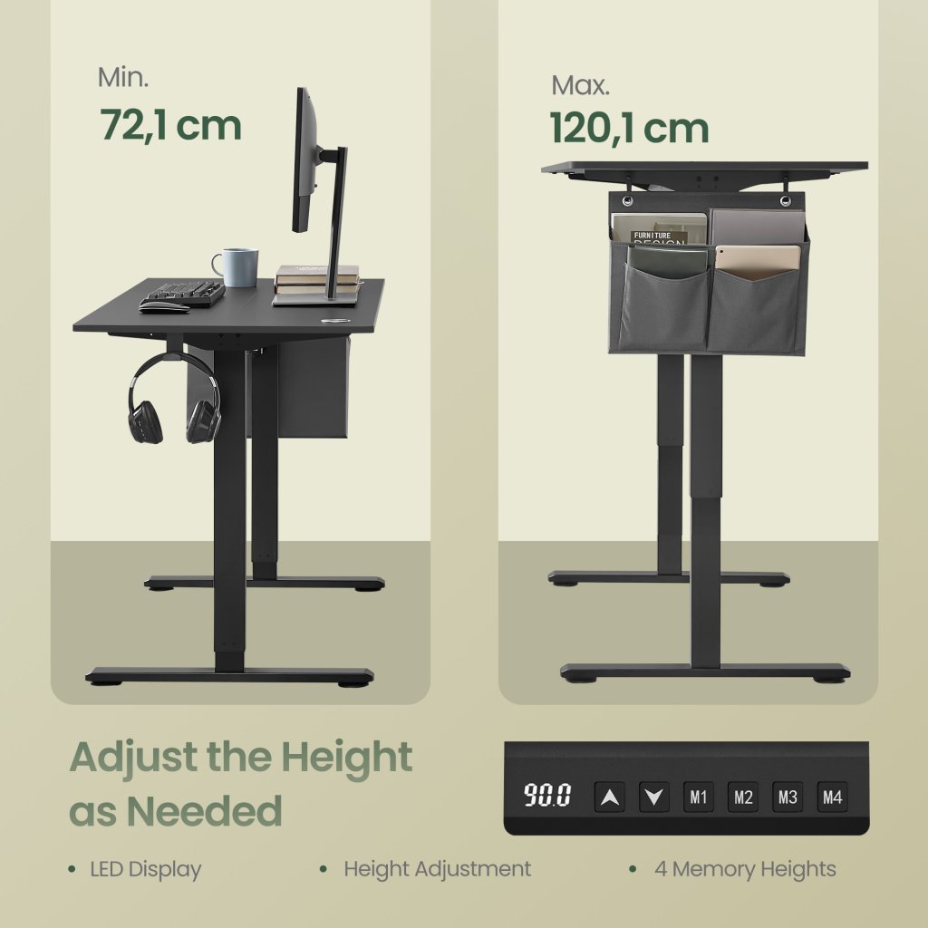 Praktický ovládací panel s pamäťovou funkciou umožňuje uložiť až 4 obľúbené výškové nastavenia, takže si rýchlo nastavíte ideálnu polohu pre komfortnú prácu. Integrované bezpečnostné prvky a ochrana proti prehriatiu zabezpečujú bezpečné používanie počas každodennej prevádzky.