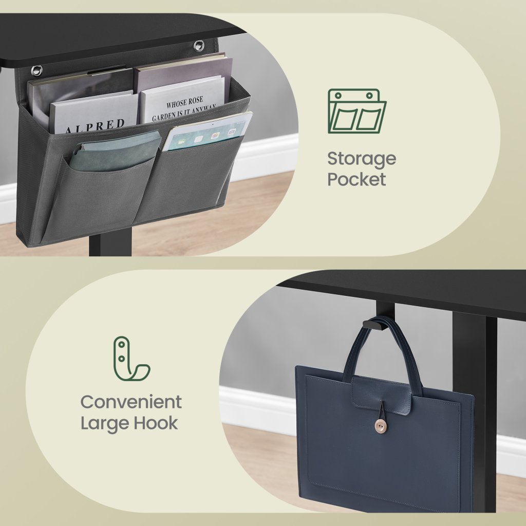 Stôl ponúka priestrannú pracovnú dosku s rozmermi 160,1 × 70,1 cm, ktorá poskytuje dostatok miesta pre monitor, notebook, dokumenty aj kancelárske príslušenstvo. Premyslené detaily, ako látkové úložné vrecko a systém na organizáciu káblov, pomáhajú udržiavať pracovný priestor čistý a prehľadný. Elegantný čierny dizajn sa perfektne hodí do modernej domácej kancelárie alebo pracovného priestoru.
