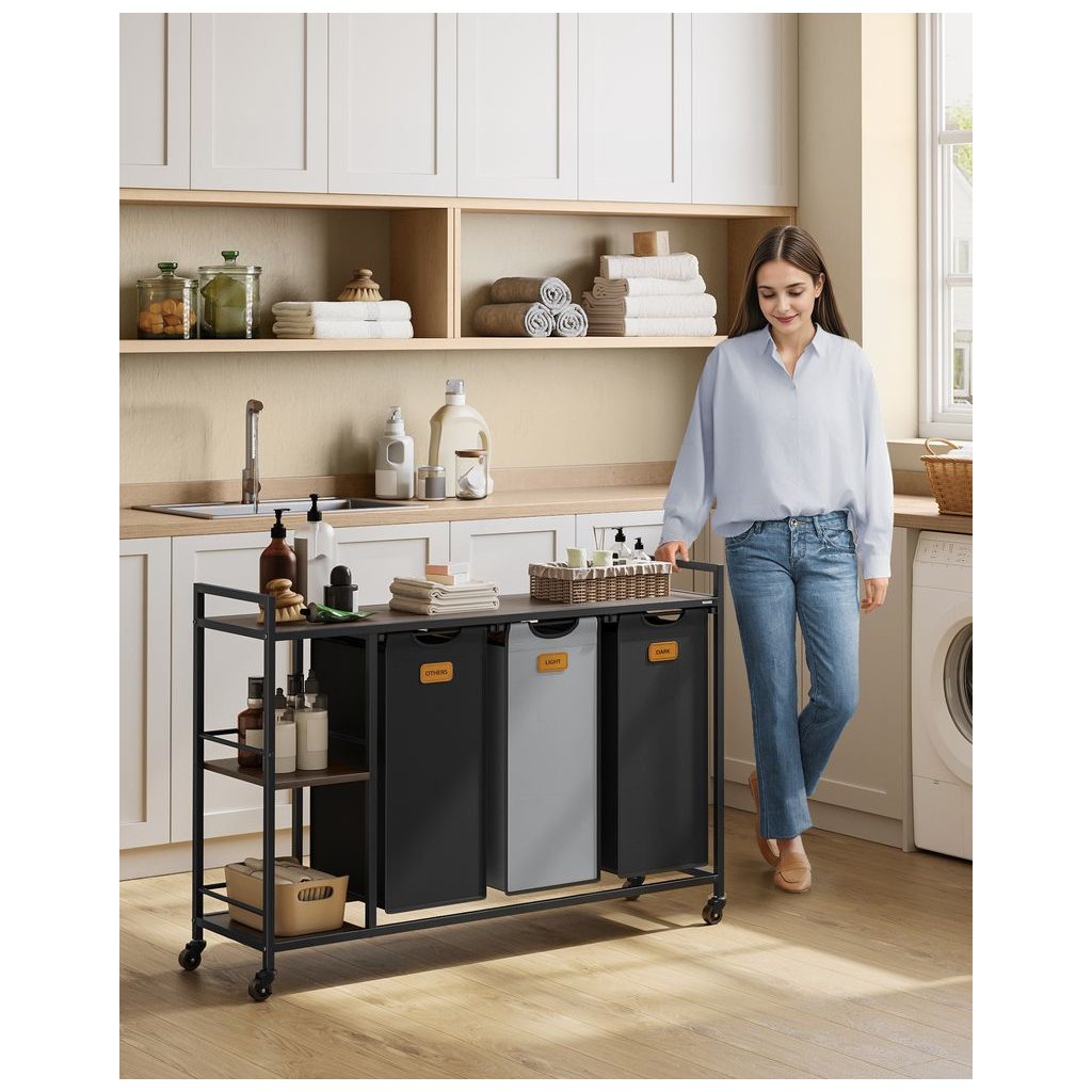 VASAGLE Kôš na bielizeň s 3 priehradkami, kolieskami a odnímateľnými vreckami BLH312B01