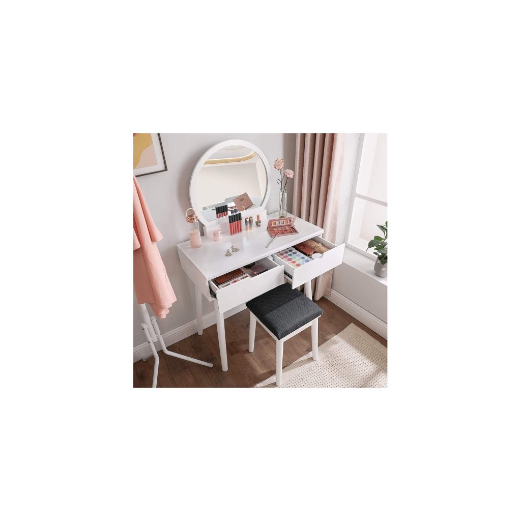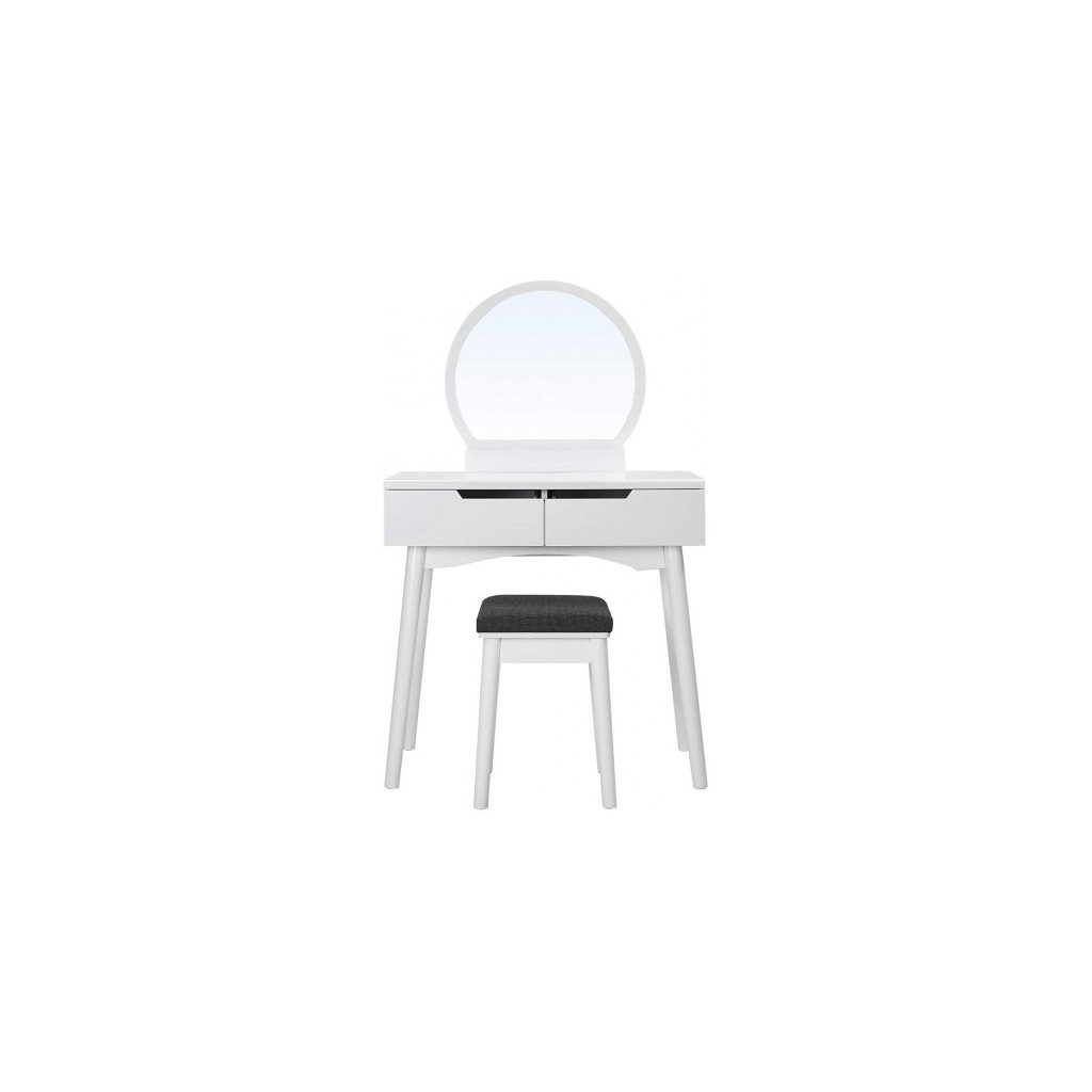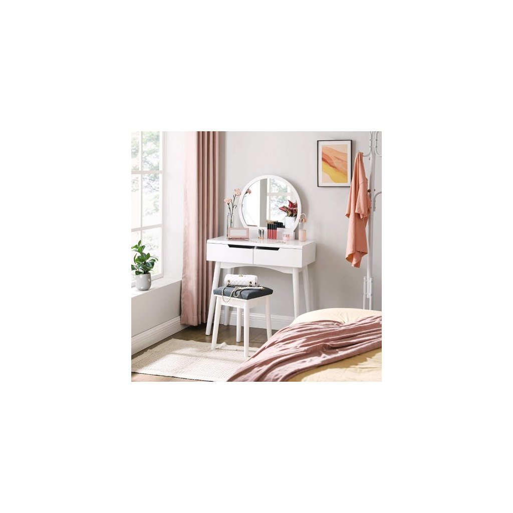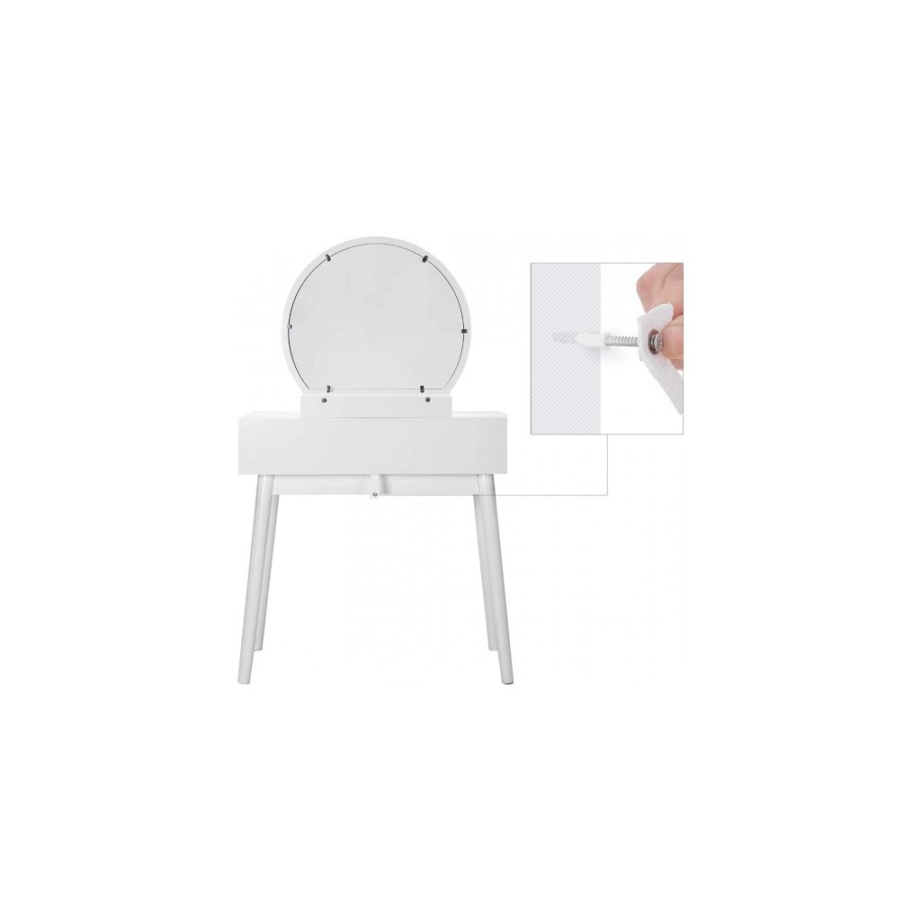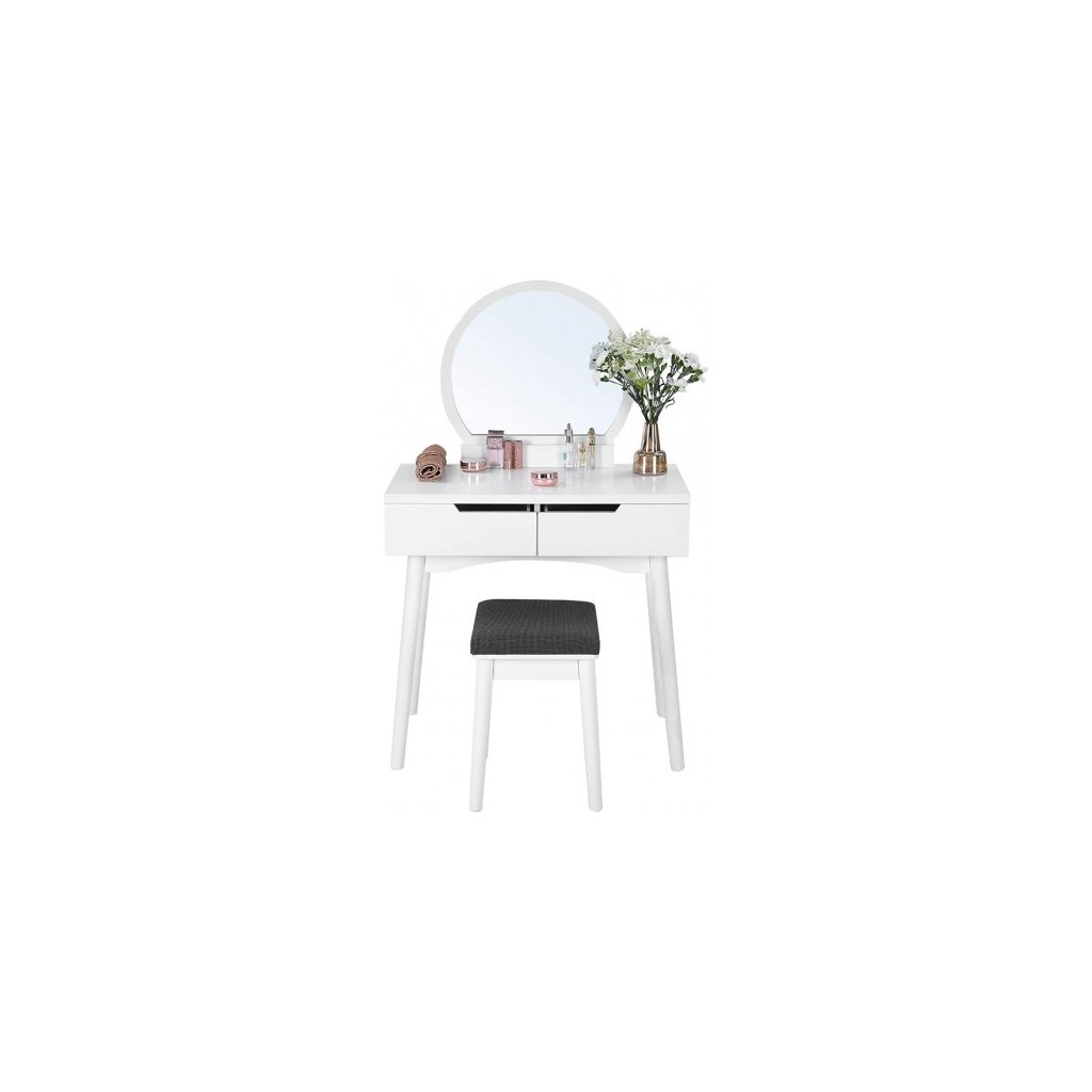 Vytvorte si svoj osobný kútik krásy. Pohľad na moderný toaletný stolík zaručuje štýlový štart do nového dňa. Tento toaletný stolík navyše dodá vašej spálni pôvab. Minimalistický biely toaletný stolík s okrúhlym zrkadlom, zásuvkami a čalúnenou stoličkou je skvelý darček pre všetky ženy. Do zásuviek aj na stolík sa zmestia všetky nutnosti - líčenie, šperky, parfém či vlasové doplnky a pod. Stolík so stoličkou môžete mať v spálni, v šatníku alebo aj v kúpeľni. Príliš veľa kozmetických výrobkov? Skrášľovacích výrobkov nikdy nemôžete mať dosť! Tento toaletný stolík má veľkú dosku stola a 2 priestranné zásuvky na koľajničkách, aby sa zabránilo neporiadku s krémami, kozmetikou a šperkami.