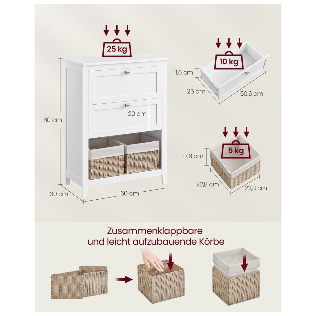 Praktická, štýlová a veľmi priestranná – táto kúpeľňová skrinka VASAGLE je ideálnym riešením na udržanie poriadku v kúpeľni. Kombinuje zásuvky, otvorené priehradky aj prenosné košíky, vďaka čomu si každý predmet nájde svoje miesto. Elegantné svetlo biele prevedenie oživí interiér a dodá mu čistý, moderný vzhľad.
