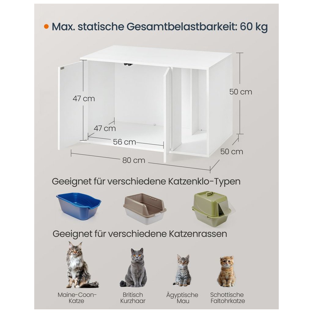 Moderná a praktická skrinka na mačaciu toaletu Feandrea ponúka ideálne spojenie elegantného dizajnu, súkromia pre mačku a čistoty pre domácnosť. Vďaka priestrannému interiéru je vhodná aj pre veľké plemená, ako je Maine Coon.