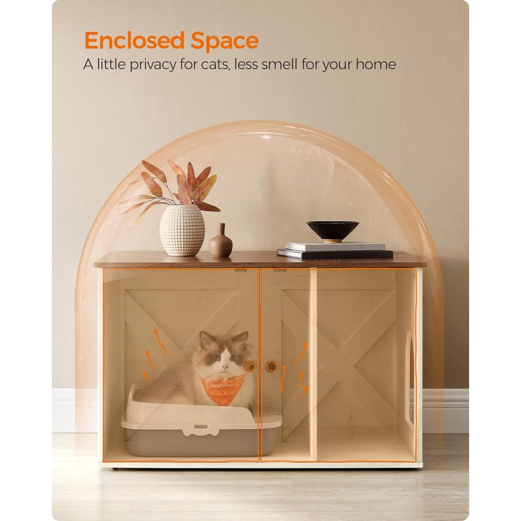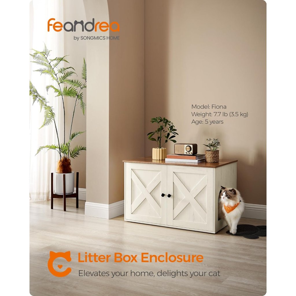 Ak hľadáte praktické, elegantné a zároveň funkčné riešenie, ktoré skryje mačaciu toaletu a zároveň zapadne do štýlu Vášho domova, mačacia búda Feandrea je tou pravou voľbou. Spojenie medovo hnedej a vintage bielej dodáva produktu moderný vzhľad s nádychom rustikálnej elegancie – konečne riešenie, ktoré nebudete musieť schovávať v kúte!
